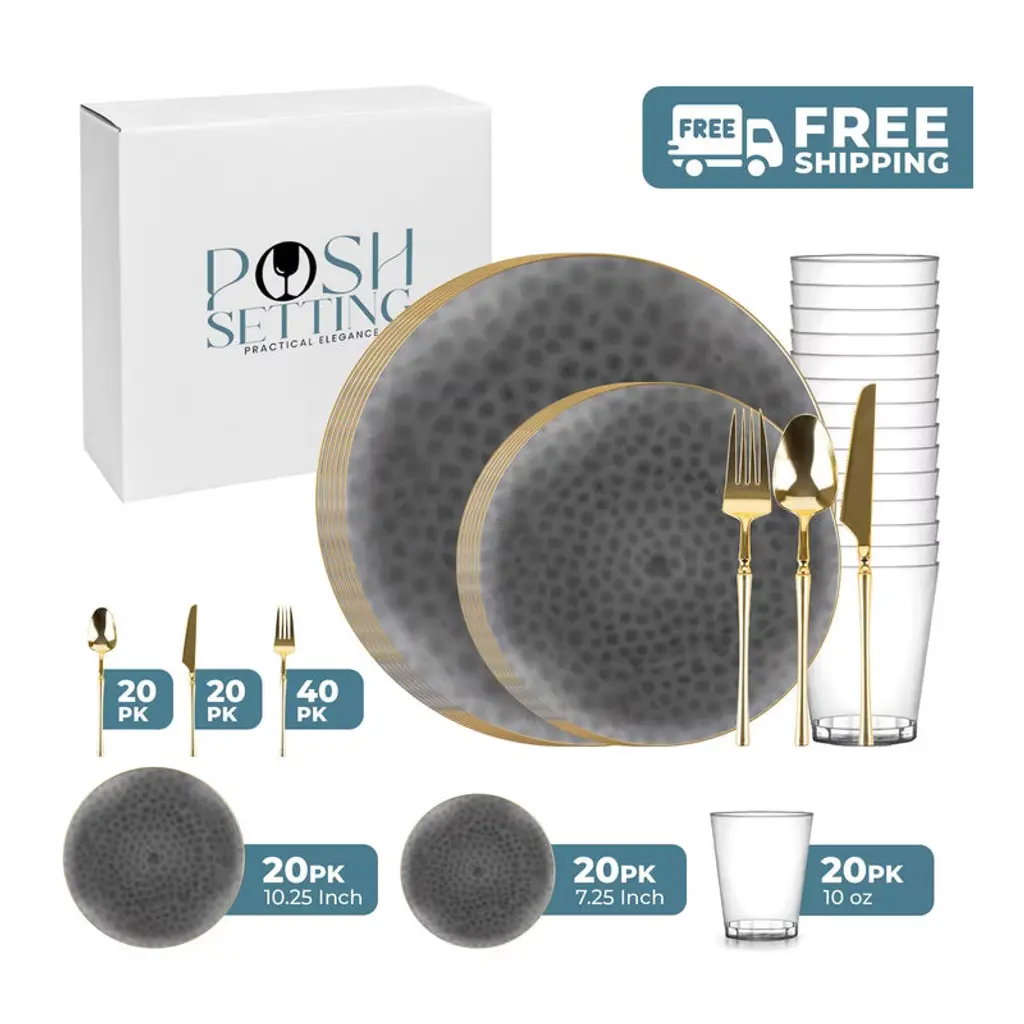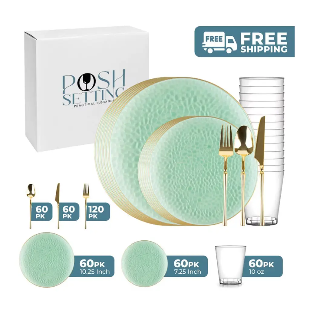 Posh Setting Elegant Green and Gold Disposable Dinnerware Bundle offers the ultimate convenience for hosting upscale events. This all-inclusive set features dinner plates, salad/appetizer plates, 10oz clear hard plastic cups, spoons, knives, and double forks per setting, all in a refined Green and Gold design. Ideal for weddings, parties, and upscale gatherings, ensuring easy cleanup.