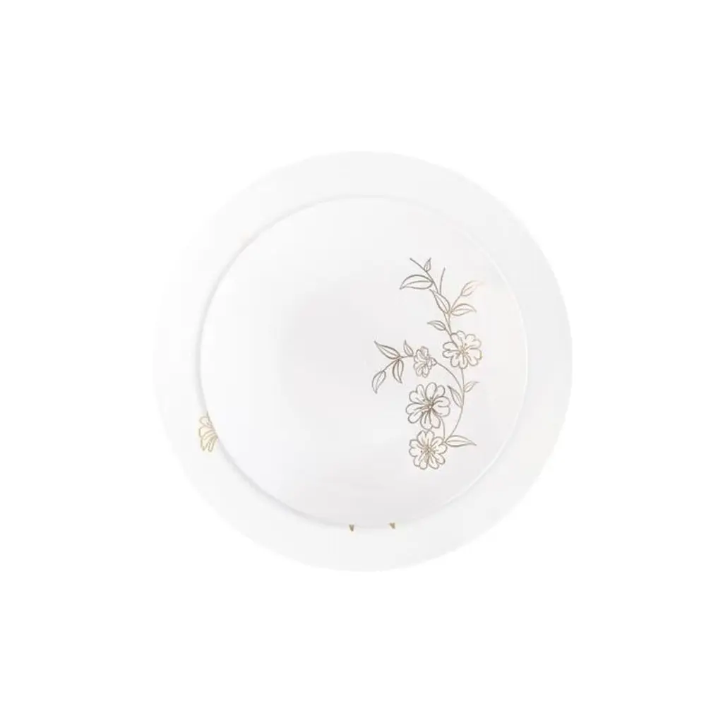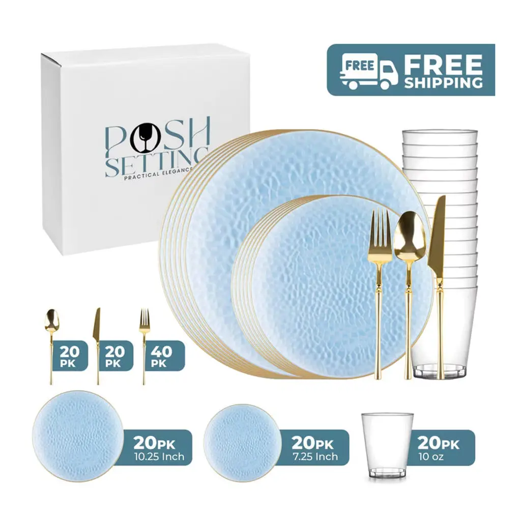 Posh Setting Elegant White and Gold Disposable Dinnerware Bundle offers the ultimate convenience for hosting upscale events. This all-inclusive set features dinner plates, salad/appetizer plates, 10oz clear hard plastic cups, spoons, knives, and double forks per setting, all in a refined White and Gold design. Ideal for weddings, parties, and upscale gatherings, ensuring easy cleanup.