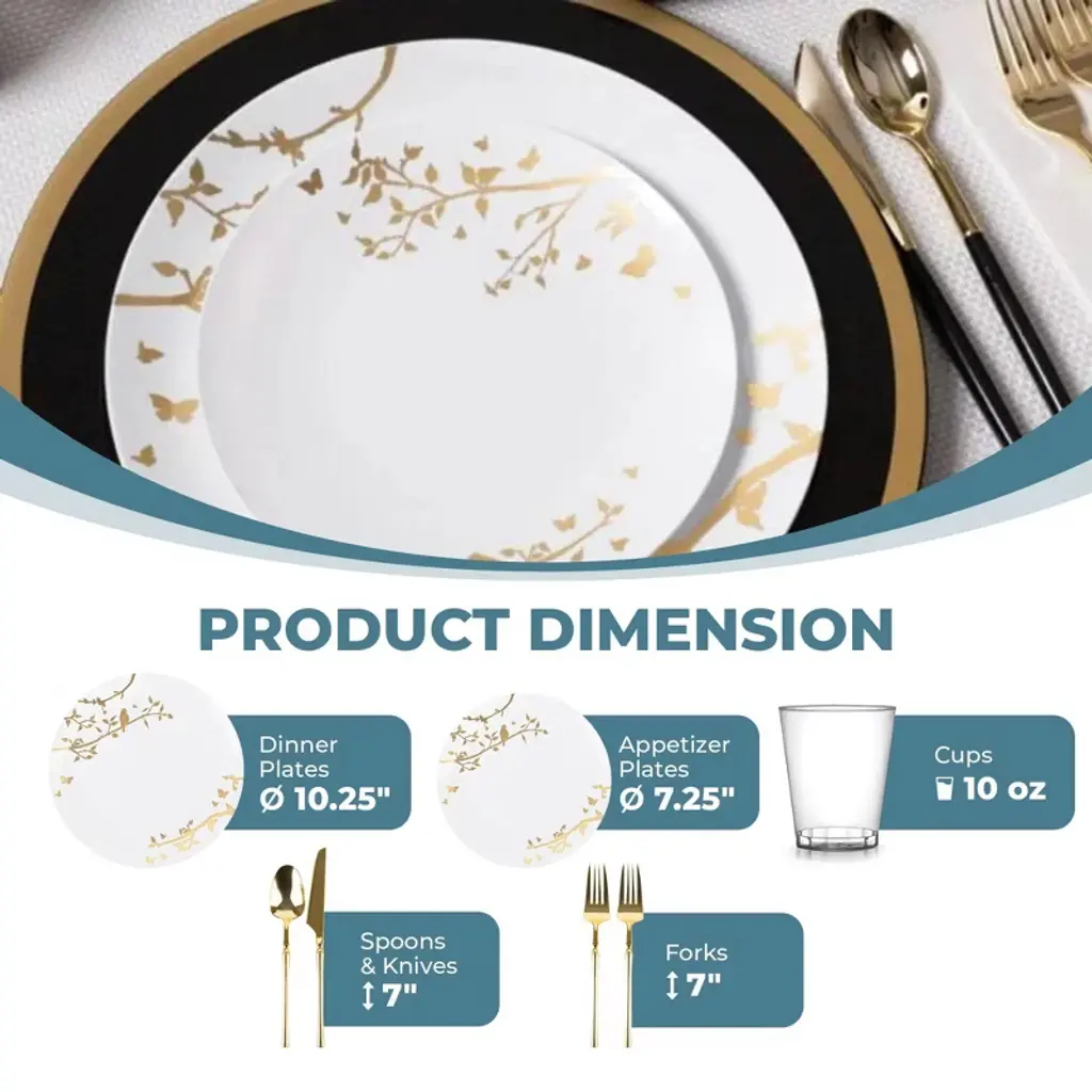 Posh Setting Elegant White and Gold Disposable Dinnerware Bundle offers the ultimate convenience for hosting upscale events. This all-inclusive set features dinner plates, salad/appetizer plates, 10oz clear hard plastic cups, spoons, knives, and double forks per setting, all in a refined White and Gold design. Ideal for weddings, parties, and upscale gatherings, ensuring easy cleanup.