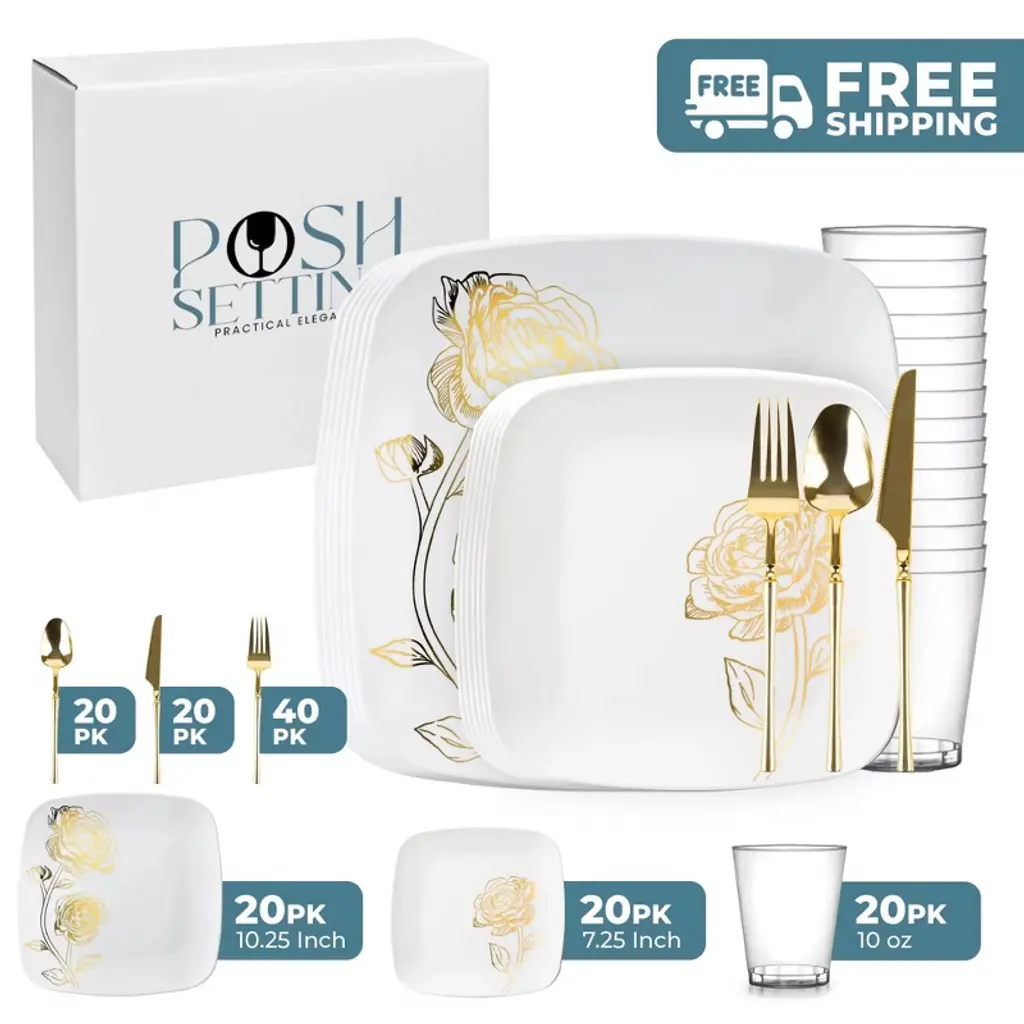 Posh Setting Elegant Black and Gold Disposable Dinnerware Bundle offers the ultimate convenience for hosting upscale events. This all-inclusive set features dinner plates, salad/appetizer plates, 10oz clear hard plastic cups, spoons, knives, and double forks per setting, all in a refined Black and Gold design. Ideal for weddings, parties, and upscale gatherings, ensuring easy cleanup.