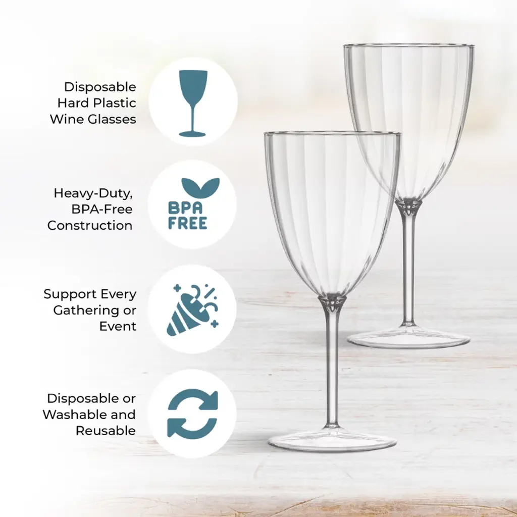 Looking for an economical wine glass for your wedding reception? How about something that looks and feels elegant for a wine tasting? We have the perfect disposable crystal-like plastic wine glasses for your needs. Made from a durable, unbreakable material these plastic wine glasses are right at home no matter how upscale your event or party may be. Add elegance to your party with these practical and pretty plastic wine goblets. A must-have for the frequent party hostess! Use it as wine cups, champagne cups, cocktail cups, juice cups, dessert cups and more. Ideal for bridal showers, engagement parties, bars, nightclubs, weddings, receptions, picnics, catered events and all occasions.