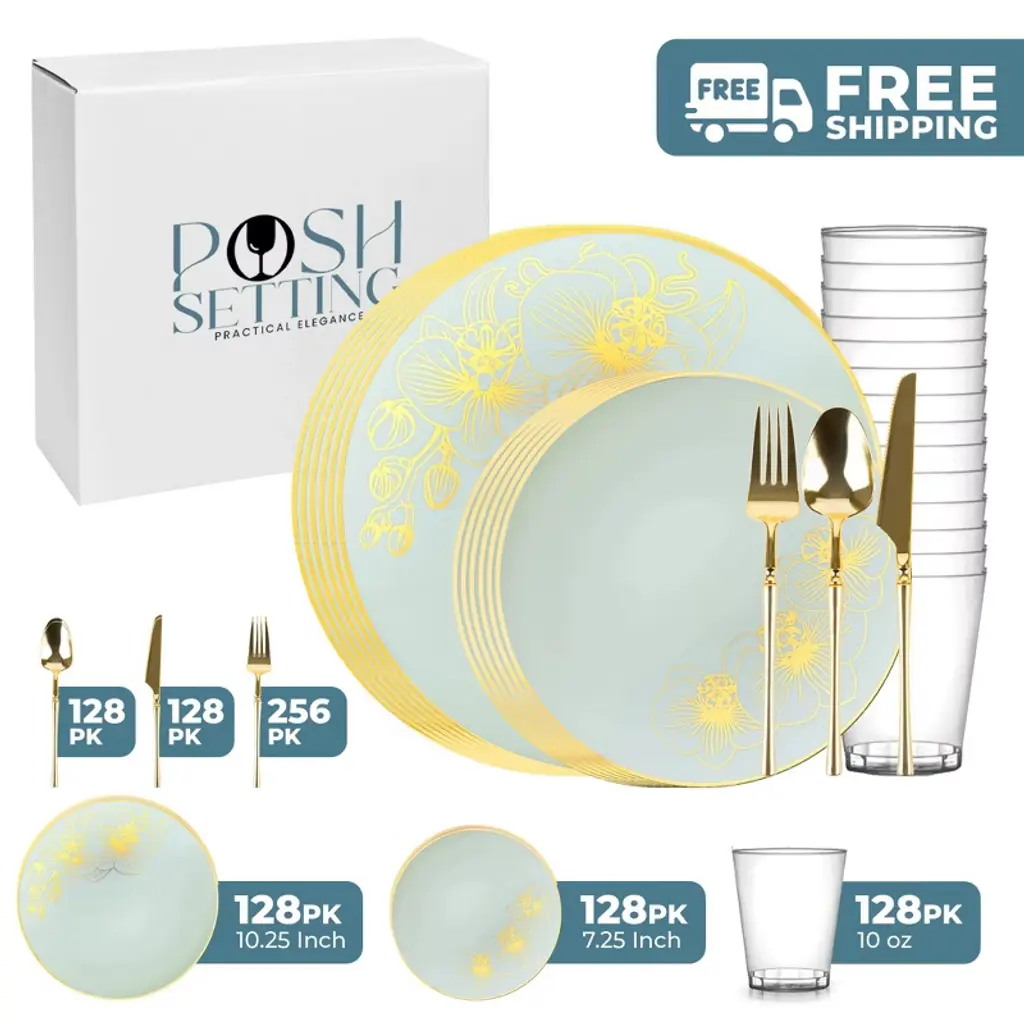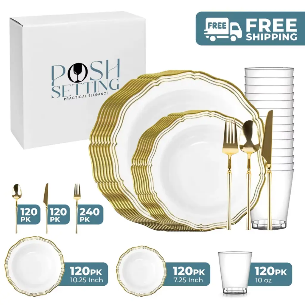 Posh Setting Elegant Clear and Gold Disposable Dinnerware Bundle offers the ultimate convenience for hosting upscale events. This all-inclusive set features dinner plates, salad/appetizer plates, 10oz clear hard plastic cups, spoons, knives, and double forks per setting, all in a refined Clear and Gold design. Ideal for weddings, parties, and upscale gatherings, ensuring easy cleanup.