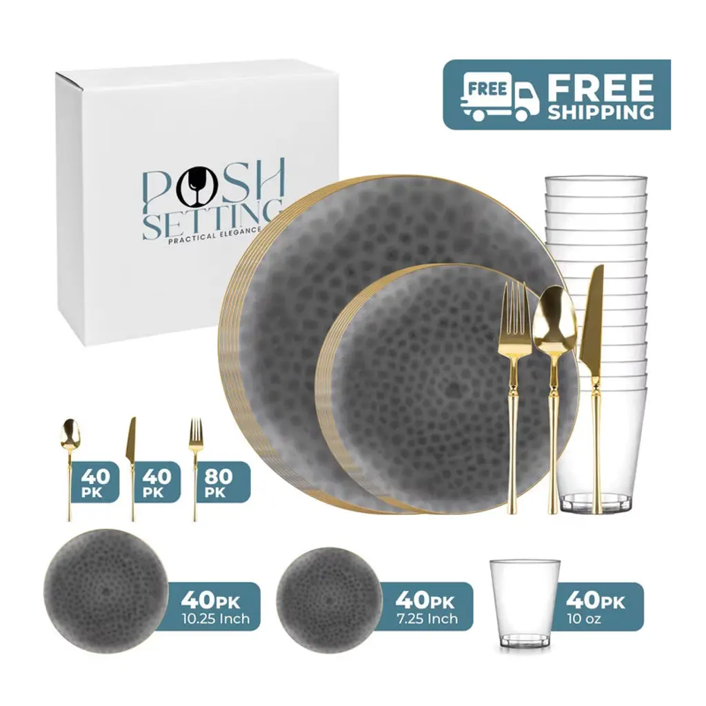 Posh Setting Elegant Clear and Gold Disposable Dinnerware Bundle offers the ultimate convenience for hosting upscale events. This all-inclusive set features dinner plates, salad/appetizer plates, 10oz clear hard plastic cups, spoons, knives, and double forks per setting, all in a refined Clear and Gold design. Ideal for weddings, parties, and upscale gatherings, ensuring easy cleanup.