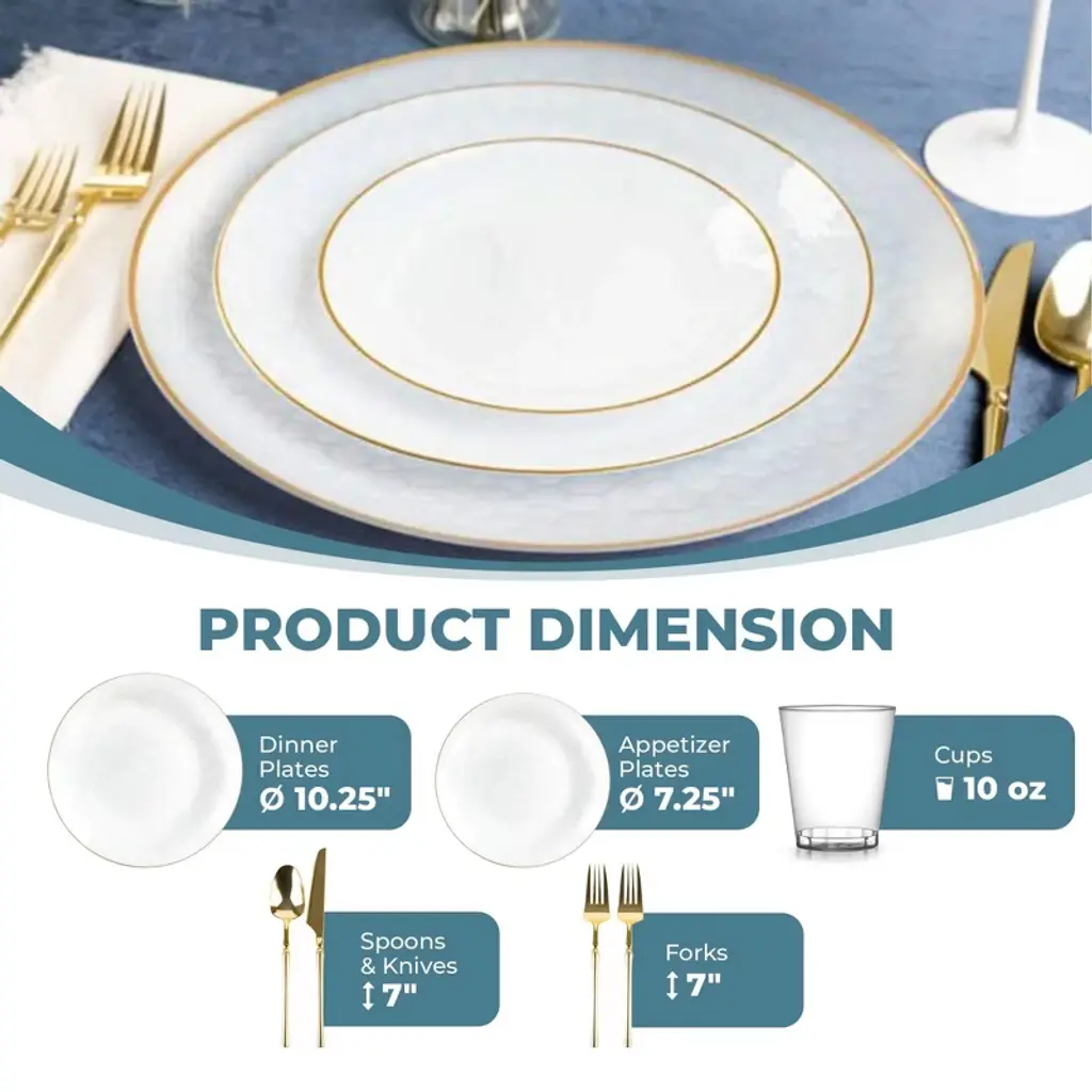 Posh Setting Elegant Transparent White and Gold Disposable Dinnerware Bundle offers the ultimate convenience for hosting upscale events. This all-inclusive set features dinner plates, salad/appetizer plates, 10oz clear hard plastic cups, spoons, knives, and double forks per setting, all in a refined Transparent and Gold design. Ideal for weddings, parties, and upscale gatherings, ensuring easy cleanup.
