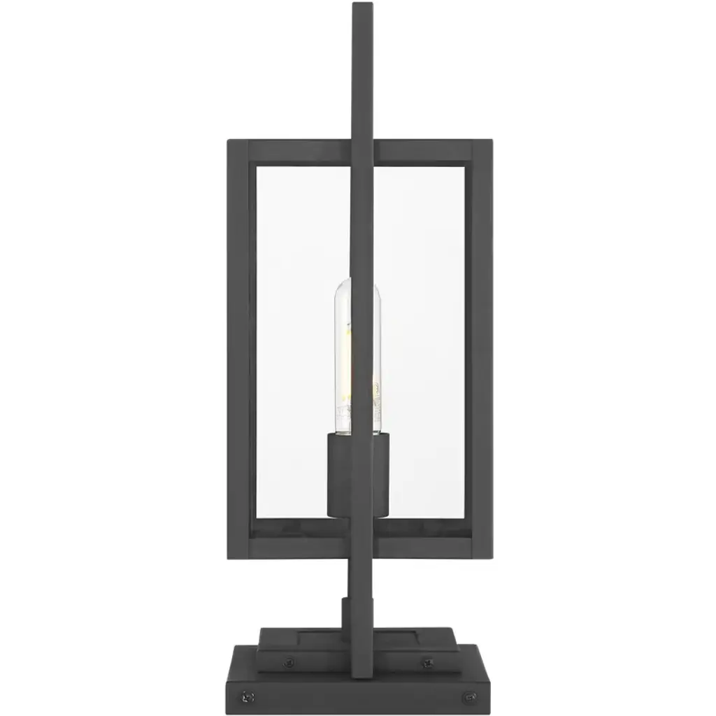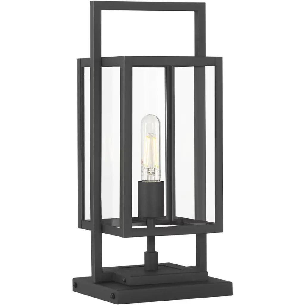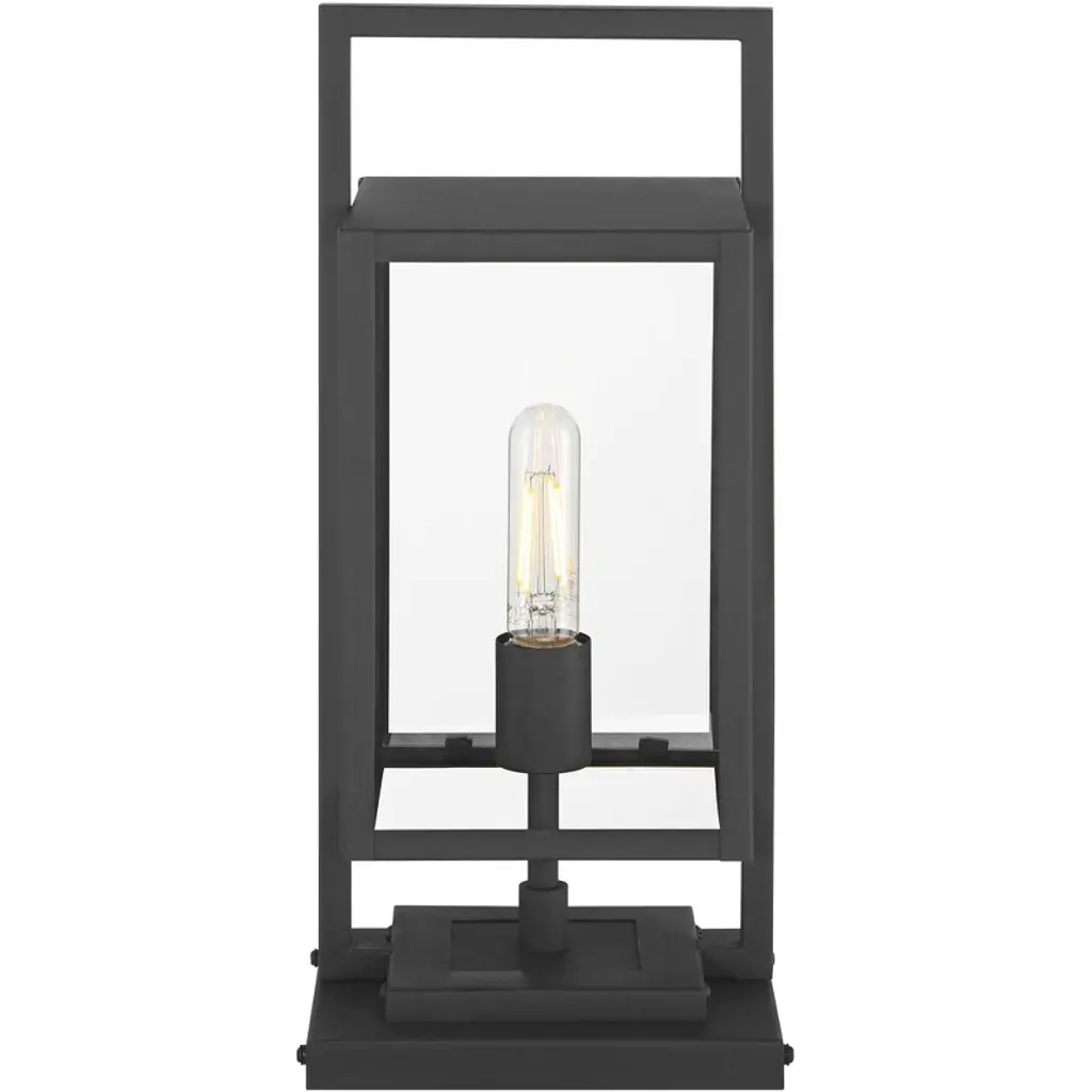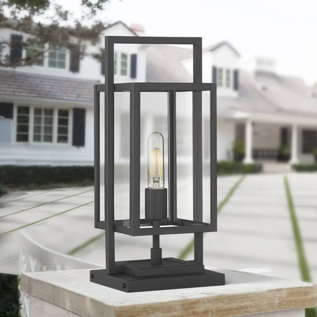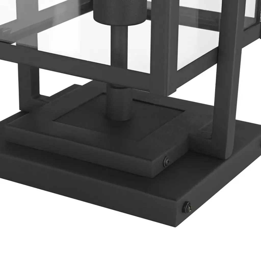 From the Jericho collection by Possini Euro Design®, this outdoor pier mount light offers a stylized modern look for your home. It comes in a black finish steel frame, with clean, straight lines and intersecting rectangles that form an eye-catching silhouette. Clear glass panels give a full view of the bulb used within, making decorative light bulbs a smart choice for this fixture.