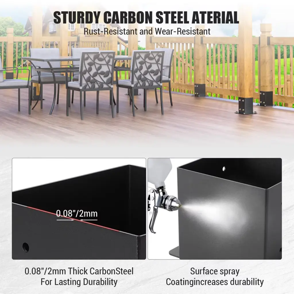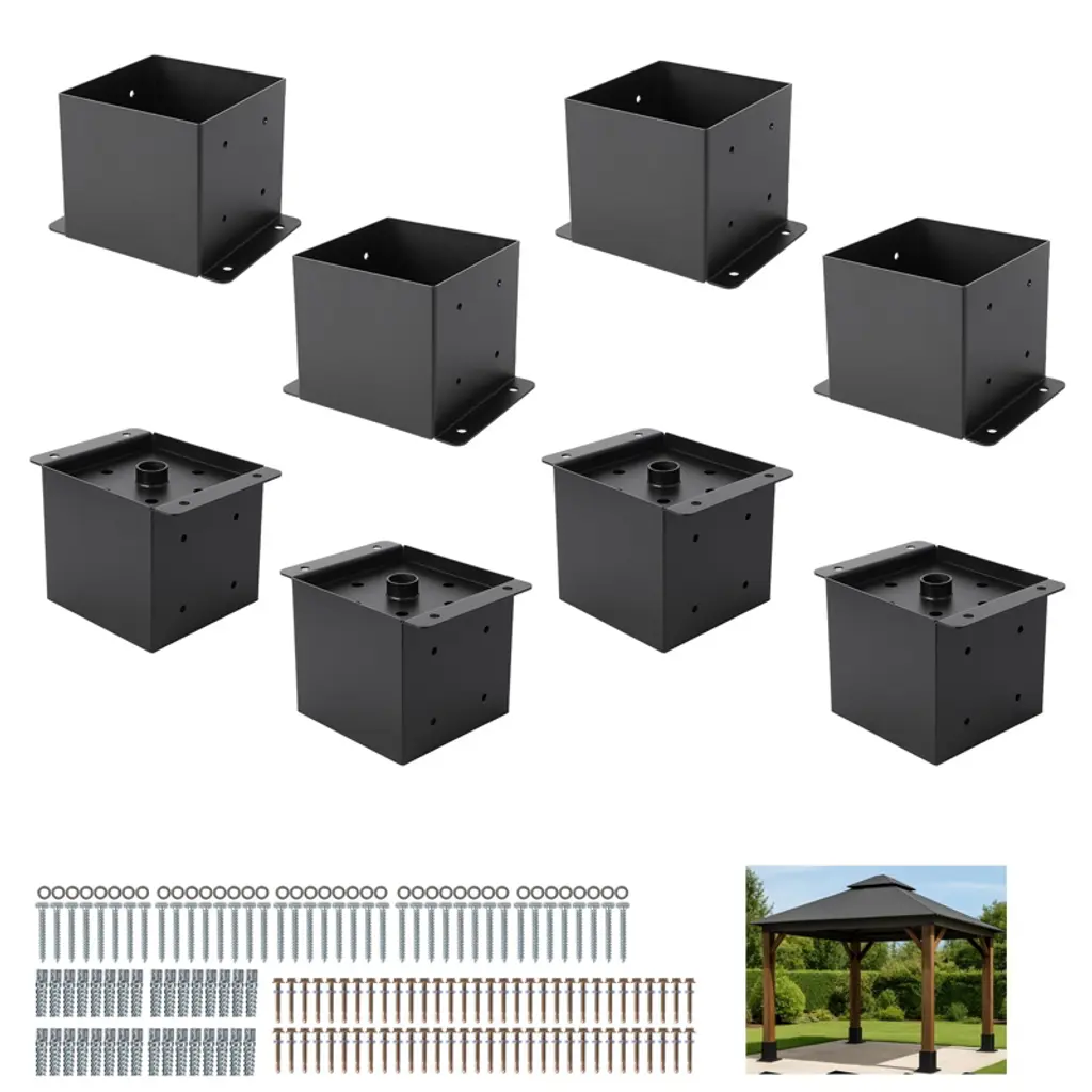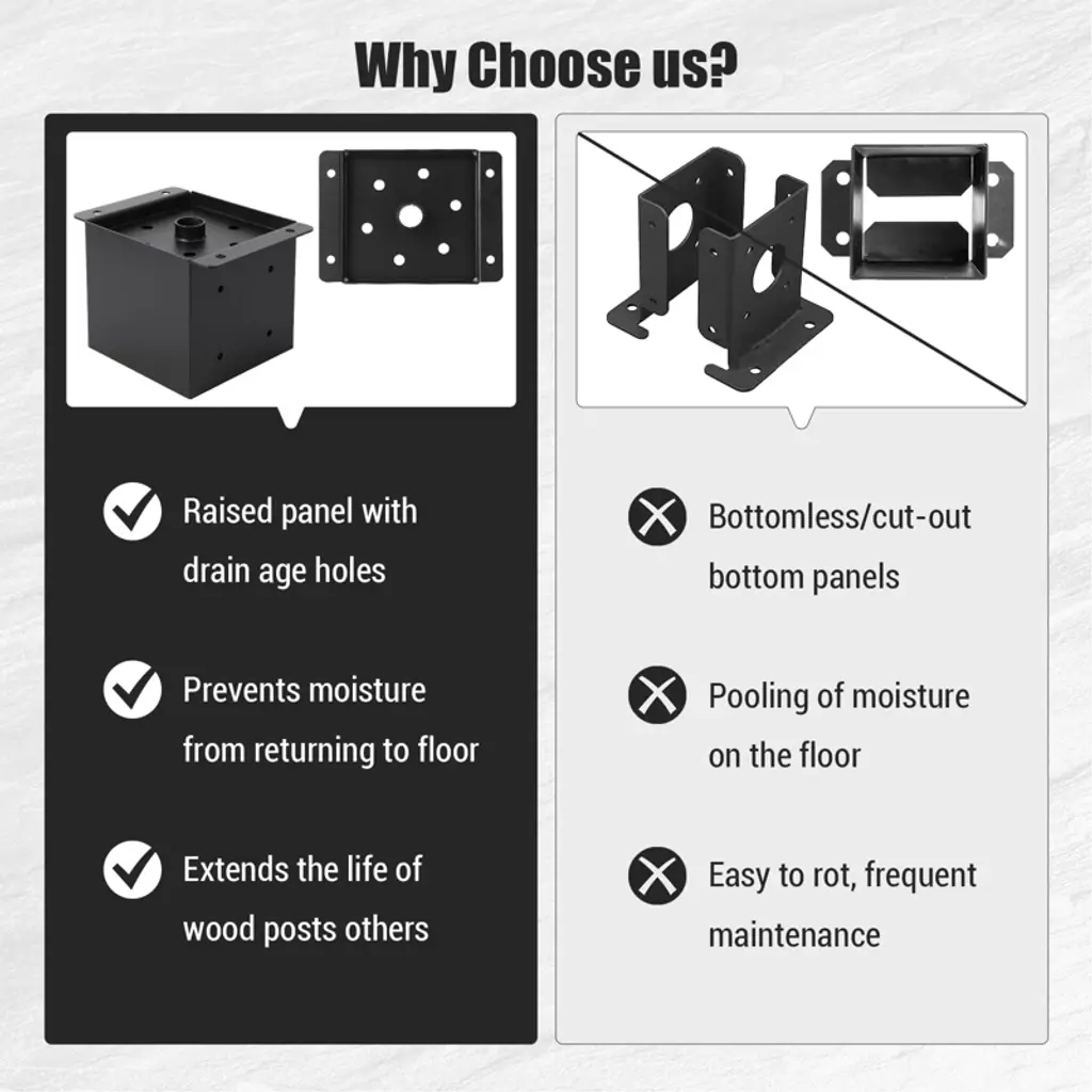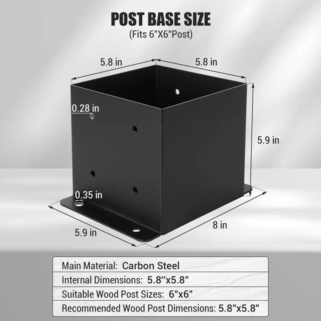 1.Multi-Use Support: Versatile for All Outdoor Structures This 4-pack of post bases is engineered to secure a wide range of outdoor projects, from deck footings and gazebo posts to porch railings, mailbox stands, and even wobbly furniture legs. The 4-pack is ideal for small upgrades¡ªlike reinforcing a loose fence section or fixing a sagging deck corner¡ªwhile larger 8-packs (available separately) cater to full-scale builds, such as new deck installations or extensive fence replacements. Whether you¡¯re a DIY homeowner or a professional contractor, these brackets provide reliable support for any outdoor structure. 2.Heavy-Duty Steel with Rust-Resistant Finish & Complete HardwareCrafted from thick, heavy-gauge steel, these brackets offer exceptional strength to bear the weight of posts and structures. The durable powder-coated finish forms a protective barrier against rust, corrosion, and UV damage, ensuring longevity even in harsh weather¡ªrain, snow, or coastal salt spray. Each pack includes a full hardware kit: weather-resistant screws for wooden surfaces and concrete anchors for slab installations, so you have everything needed for a secure, hassle-free setup without extra trips to the store. 3.Perfect Fit for 6x6 Posts: Ideal for Decks, Fences & MoreDesigned to snugly fit standard 6x6 lumber (actual dimensions: 5.75¡±x5.75¡±), these flanged-end post bases prevent shifting and wobbling, whether you¡¯re installing deck posts, fence posts, or pergola supports. The wide, stable flange distributes weight evenly across the base, reducing stress on the post and extending its lifespan. From minor repairs (like stabilizing a leaning mailbox) to full rebuilds (such as a new backyard deck), these brackets ensure a tight, long-lasting connection. 4.Pre-Drilled Holes for Quick, Wobble-Free InstallationFeaturing precision-aligned pre-drilled holes, these brackets simplify installation¡ªno measuring or guesswork required. The holes ensure the base sits flush against wooden frames or concrete slabs, creating a stable, wobble-free attachment. Whether mounting to deck joists or concrete patios, the hardware fits seamlessly, allowing you to secure posts in minutes rather than hours. 5.Elevated Design Prevents Rot & Water DamageWith a 0.4-inch raised base and integrated drainage holes, these anchors keep posts elevated above ground, preventing direct contact with moisture. This design stops water from pooling around the post base, reducing the risk of rot, mold, or warping¡ªcommon issues that shorten post lifespan. Built to withstand extreme weather, from heavy rains to freezing temperatures, these brackets keep your posts dry and sturdy for years.