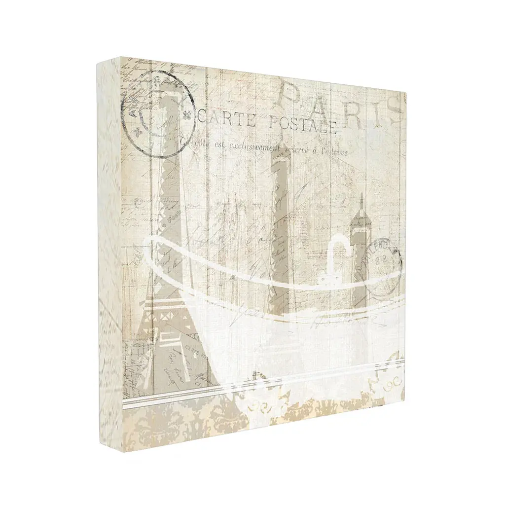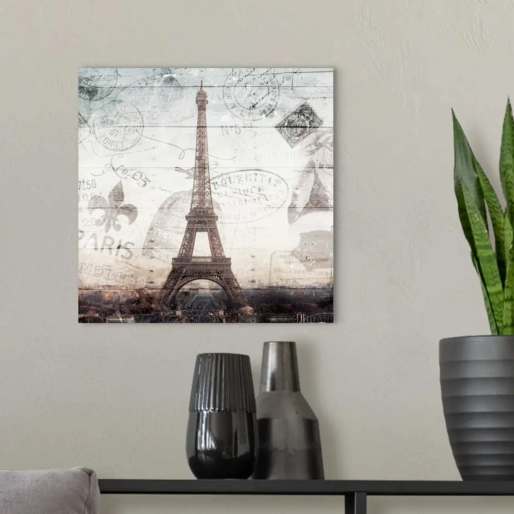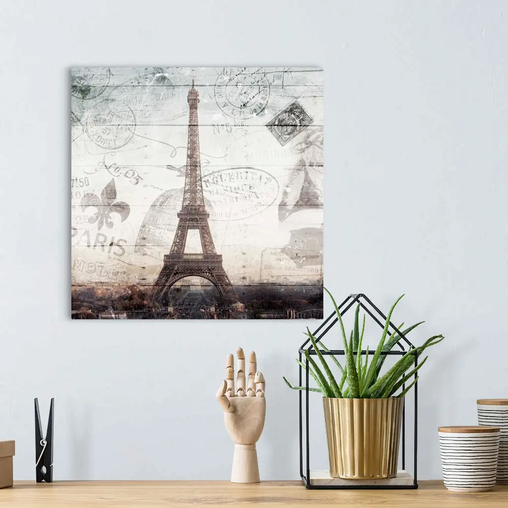 Square photograph of the Eiffel Tower with a Paris cityscape underneath and a faint wood panel and postage stamp overlay.
