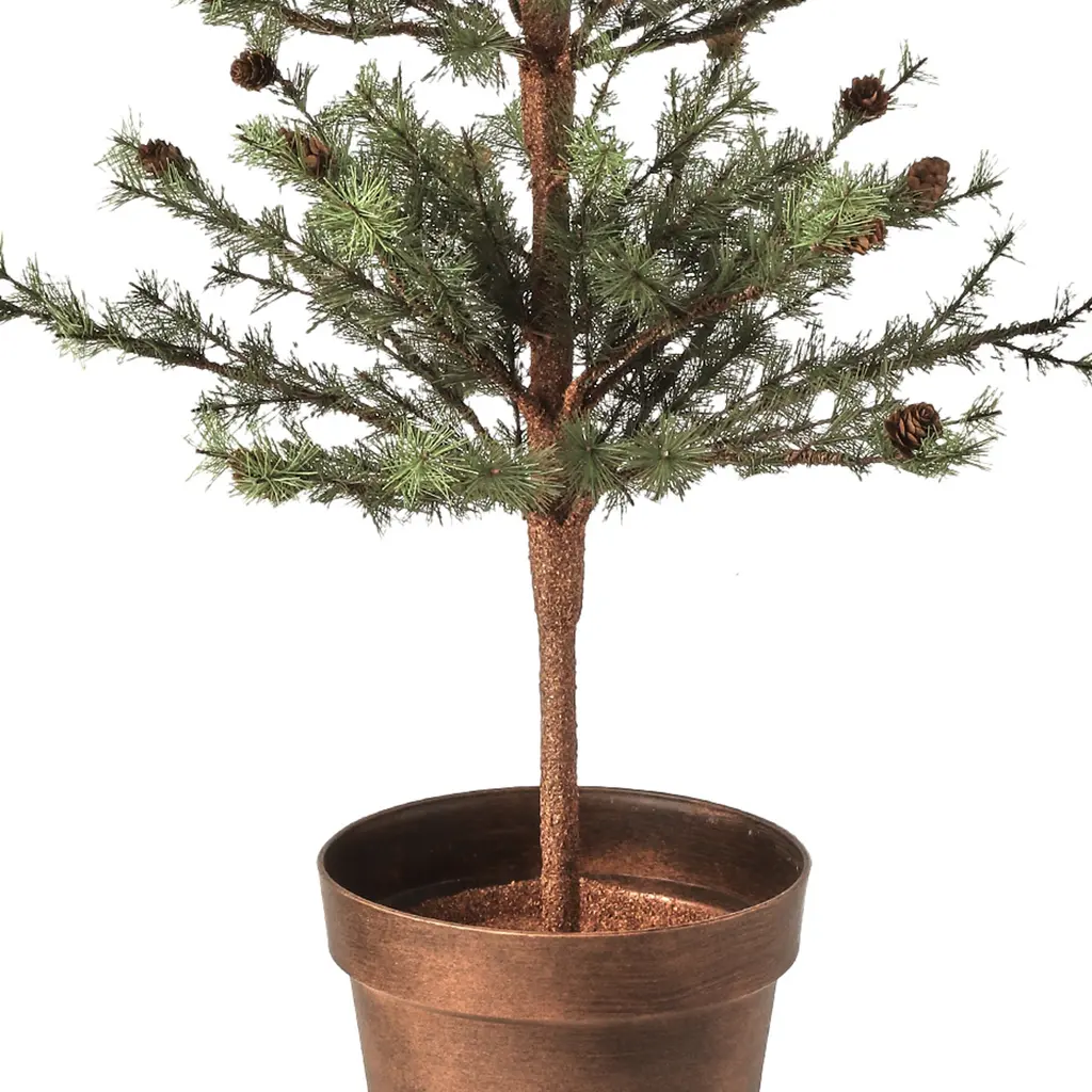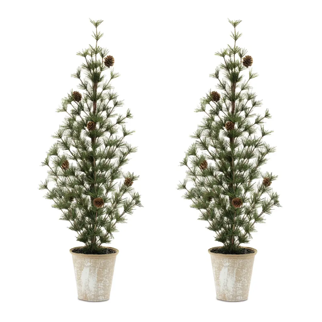 Create a warm and inviting holiday atmosphere with this Potted Mini Pine Tree Set. Standing about 2.5' tall, these lush green pine trees feature a traditional shape with wired branches for easy styling. Each tree is housed in a trendy whitewashed planter base, adding a touch of modern rustic charm to your seasonal décor. Accented with natural pinecones, this set of two is perfect for entryways, mantels, or fireplace displays, bringing effortless holiday elegance to any space.