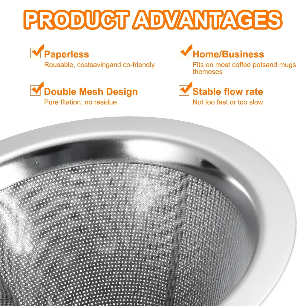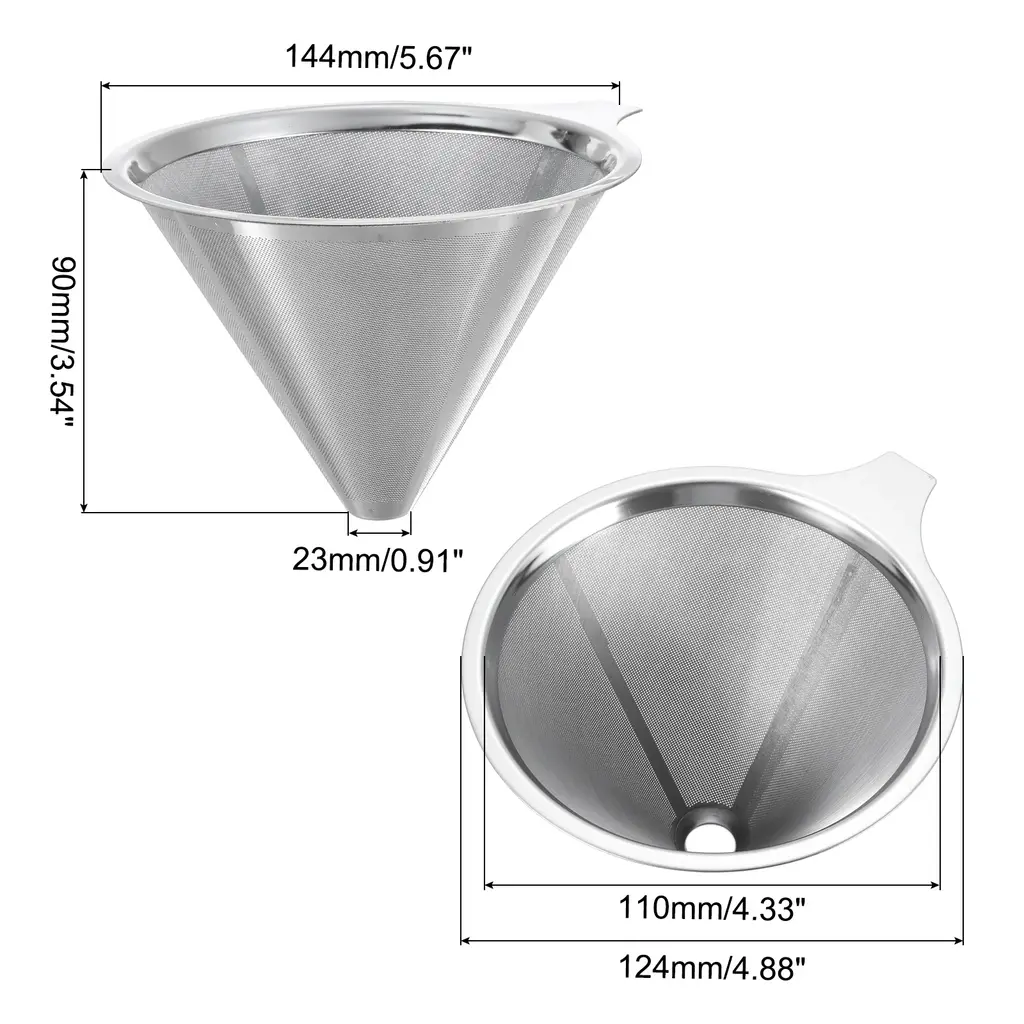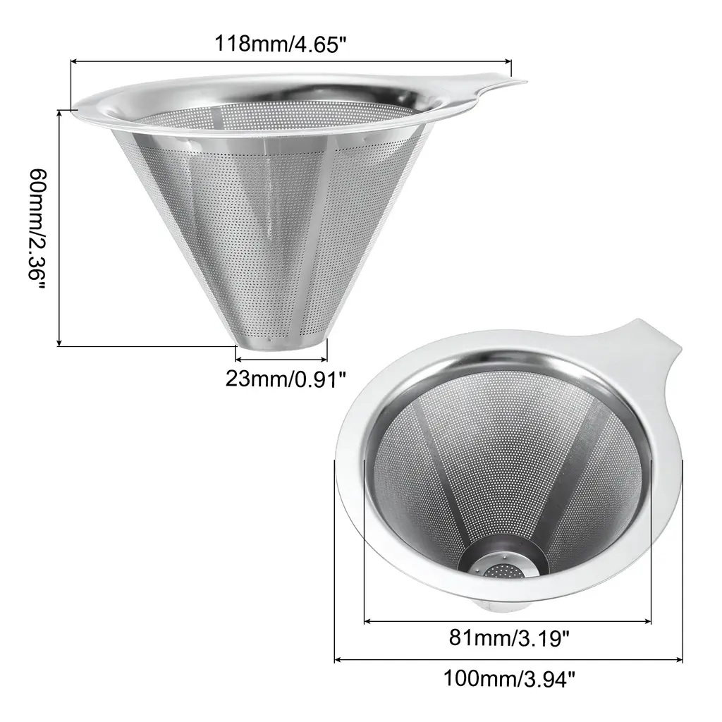 Description:【TRUE COFFEE TASTE】Slow drip pour-over coffee dripper retains the oil and fat of the coffee, making the coffee flavor better. It is for a coffee make enjoy a more relaxed and pleasant life.【TOP MESH DESIGN】The coffee filter is made of stainless steel without paper filters, about 300 mesh per square inch. The bottom is integrated with the filter, solid and not broken. The dual coffee filter brewing design prevents any coffee grounds from passing, no grounds end up in your cup.【SIMPLE TO USE】Simply heat the pour over coffee filter with hot water and rinse out, add coffee grounds, slowly pour in the hot water, let the coffee maker drip out the water through the fine pour over filter, and remove the coffee dripper when done, ready to enjoy your drink.【PORTABLE】Compact and lightweight, the coffee dripper works great at home or work or while traveling or camping.【EASY TO CLEAN】Our single-cup coffee maker rinse quickly. Clean thoroughly every 3-4 weeks to the pour-over filter with distilled vinegar and warm water, or leave the cone coffee filter in the oven for 4 ~ 5 minutes.Specification:Material: Stainless SteelShape: Cone Color: SilverMesh Design: 300 meshSize: Top outer diameter: 100mm/3.94in, Top diameter: 81mm/3.19in, Bottom diameter: 23mm/0.91in, Height: 60mm/2.36in, Length: 118mm/4.65inchPackage Included: 1 Pcs x Reusable Coffee Filter
