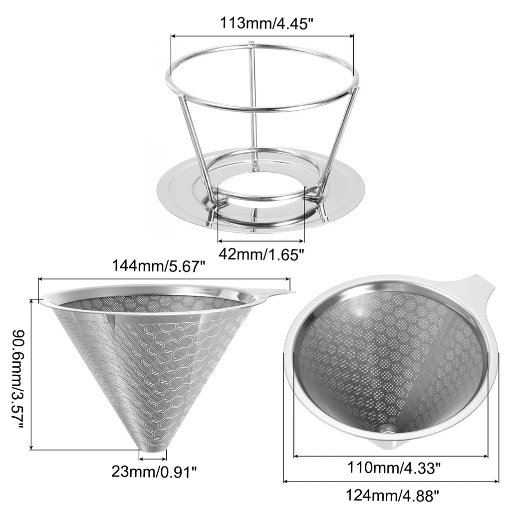 Description:【TRUE COFFEE TASTE】Slow drip pour-over coffee dripper retains the oil and fat of the coffee, making the coffee flavor better. It is for a coffee make enjoy a more relaxed and pleasant life.【TOP MESH DESIGN】The coffee filter is made of stainless steel without paper filters, about 300 mesh per square inch. The bottom is integrated with the filter, solid and not broken. The dual coffee filter brewing design prevents any coffee grounds from passing, no grounds end up in your cup.【SIMPLE TO USE】Simply heat the pour over coffee filter with hot water and rinse out, add coffee grounds, slowly pour in the hot water, let the coffee maker drip out the water through the fine pour over filter, and remove the coffee dripper when done, ready to enjoy your drink.【PORTABLE】Compact and lightweight, the coffee dripper works great at home or work or while traveling or camping.【EASY TO CLEAN】Our single-cup coffee maker rinse quickly. Clean thoroughly every 3-4 weeks to the pour-over filter with distilled vinegar and warm water, or leave the cone coffee filter in the oven for 4 ~ 5 minutes.Specification:Material: Stainless SteelShape: Cone Color: SilverMesh Design: 300 meshSize: Top outer diameter: 100mm/3.94in, Top diameter: 81mm/3.19in, Bottom diameter: 23mm/0.91in, Height: 60mm/2.36in, Length: 117mm/4.61in,outer diameter: 100mm/3.94in, Bracket bottom diameter: 42mm/1.65in, Bracket top inner diameter: 85mm/3.35inPackage Included: 1 Pcs x Reusable Coffee Filter