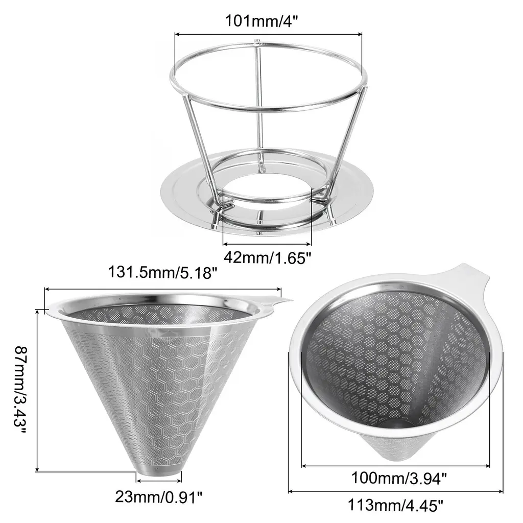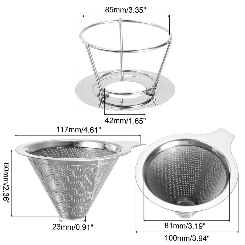 Description:【TRUE COFFEE TASTE】Slow drip pour-over coffee dripper retains the oil and fat of the coffee, making the coffee flavor better. It is for a coffee make enjoy a more relaxed and pleasant life.【TOP MESH DESIGN】The coffee filter is made of stainless steel without paper filters, about 300 mesh per square inch. The bottom is integrated with the filter, solid and not broken. The dual coffee filter brewing design prevents any coffee grounds from passing, no grounds end up in your cup.【SIMPLE TO USE】Simply heat the pour over coffee filter with hot water and rinse out, add coffee grounds, slowly pour in the hot water, let the coffee maker drip out the water through the fine pour over filter, and remove the coffee dripper when done, ready to enjoy your drink.【PORTABLE】Compact and lightweight, the coffee dripper works great at home or work or while traveling or camping.【EASY TO CLEAN】Our single-cup coffee maker rinse quickly. Clean thoroughly every 3-4 weeks to the pour-over filter with distilled vinegar and warm water, or leave the cone coffee filter in the oven for 4 ~ 5 minutes.Specification:Material: Stainless SteelShape: Cone Color: SilverMesh Design: 300 meshSize: Top outer diameter: 100mm/3.94in, Top diameter: 81mm/3.19in, Bottom diameter: 23mm/0.91in, Height: 60mm/2.36in, Length: 117mm/4.61in,outer diameter: 100mm/3.94in, Bracket bottom diameter: 42mm/1.65in, Bracket top inner diameter: 85mm/3.35inPackage Included: 1 Pcs x Reusable Coffee Filter