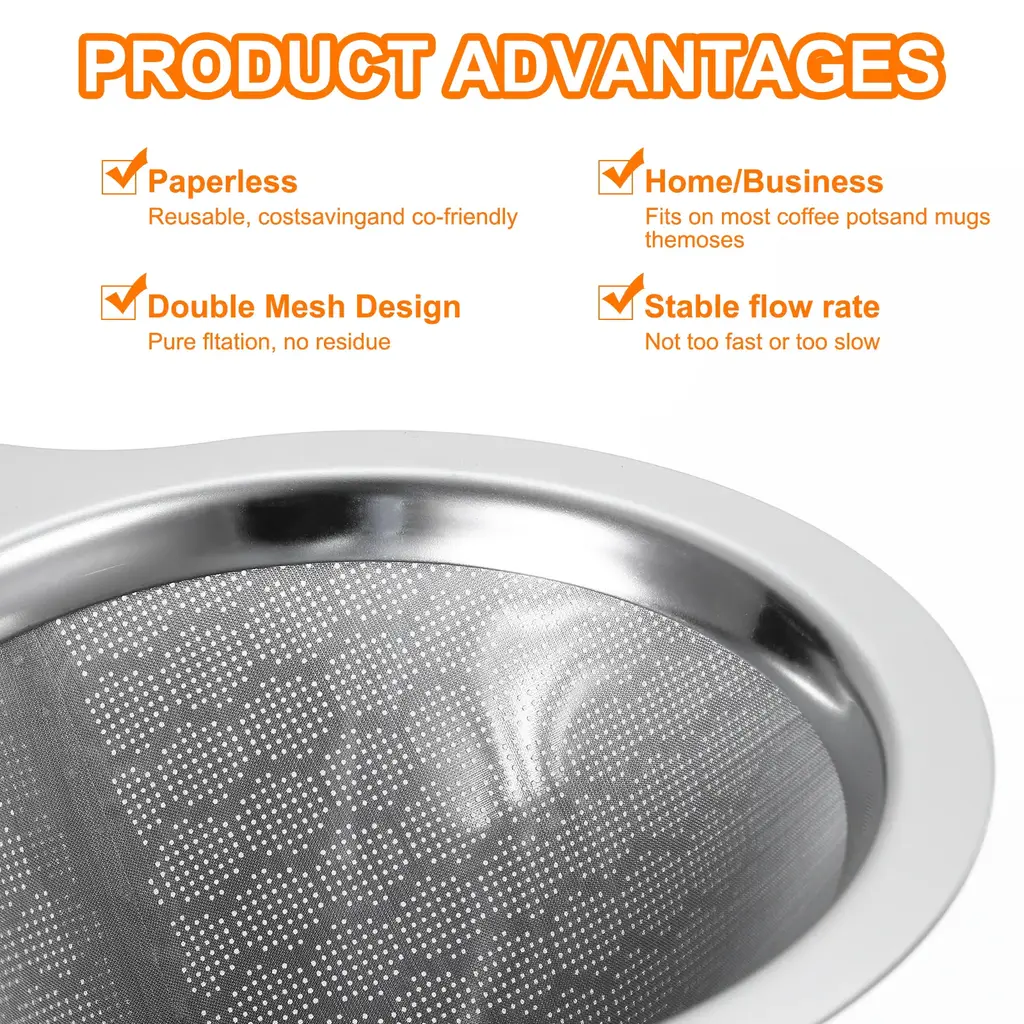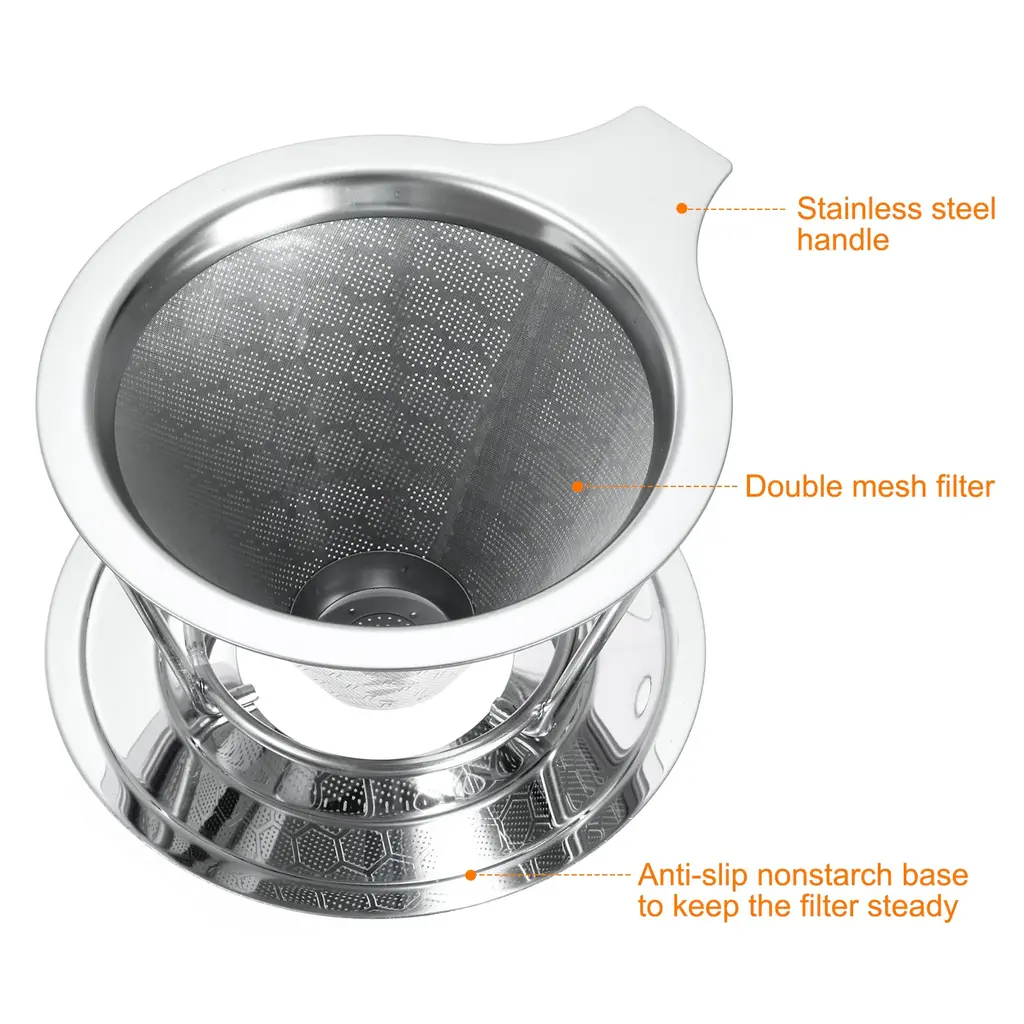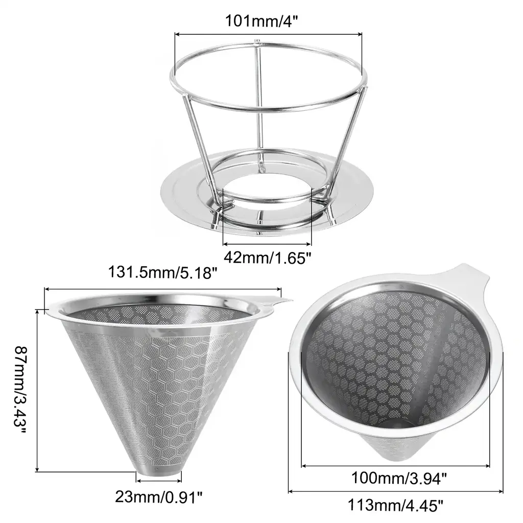 Description:【TRUE COFFEE TASTE】Slow drip pour-over coffee dripper retains the oil and fat of the coffee, making the coffee flavor better. It is for a coffee make enjoy a more relaxed and pleasant life.【TOP MESH DESIGN】The coffee filter is made of stainless steel without paper filters, about 300 mesh per square inch. The bottom is integrated with the filter, solid and not broken. The dual coffee filter brewing design prevents any coffee grounds from passing, no grounds end up in your cup.【SIMPLE TO USE】Simply heat the pour over coffee filter with hot water and rinse out, add coffee grounds, slowly pour in the hot water, let the coffee maker drip out the water through the fine pour over filter, and remove the coffee dripper when done, ready to enjoy your drink.【PORTABLE】Compact and lightweight, the coffee dripper works great at home or work or while traveling or camping.【EASY TO CLEAN】Our single-cup coffee maker rinse quickly. Clean thoroughly every 3-4 weeks to the pour-over filter with distilled vinegar and warm water, or leave the cone coffee filter in the oven for 4 ~ 5 minutes.Specification:Material: Stainless SteelShape: Cone Color: SilverMesh Design: 300 meshSize: Top outer diameter: 100mm/3.94in, Top diameter: 81mm/3.19in, Bottom diameter: 23mm/0.91in, Height: 60mm/2.36in, Length: 117mm/4.61in,outer diameter: 100mm/3.94in, Bracket bottom diameter: 42mm/1.65in, Bracket top inner diameter: 85mm/3.35inPackage Included: 1 Pcs x Reusable Coffee Filter