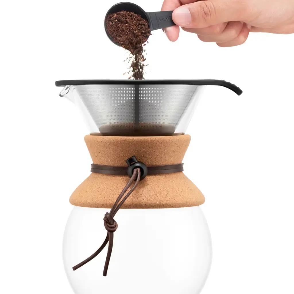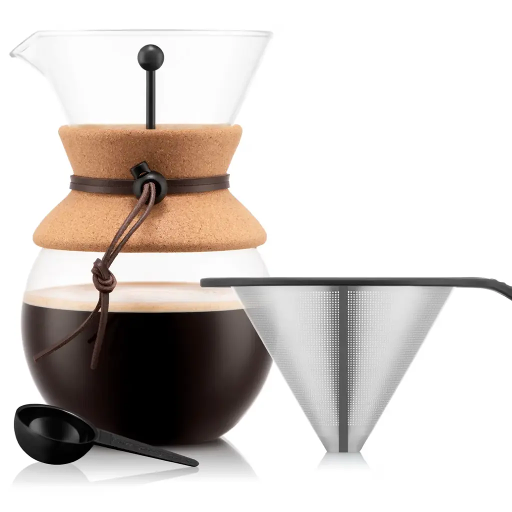 Bodum’s Pour Over coffee maker is the key to making richer, bolder coffee from the comfort of your home. Its design-led aesthetic is a stylish addition to any kitchen, but it’s the resulting full-bodied, smooth tasting coffee with a robust aroma that will win your heart.Made from premium quality borosilicate glass that doesn’t absorb taste or aroma, the beautifully shaped carafe is fitted with a permanent stainless steel filter for truly sustainable brewing. No wasteful paper filters that trap essential oils and flavour; just pure flavoursome coffee.Pour over brewing encourages a more mindful start to your day. This innovative, fuss-free filter coffee maker is simple to use and gives you ultimate control over your cup of joe.