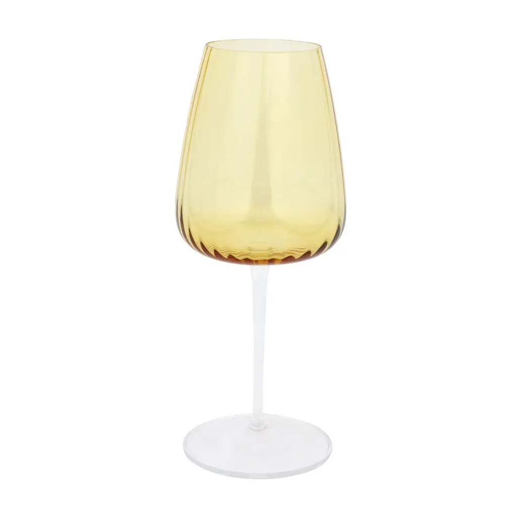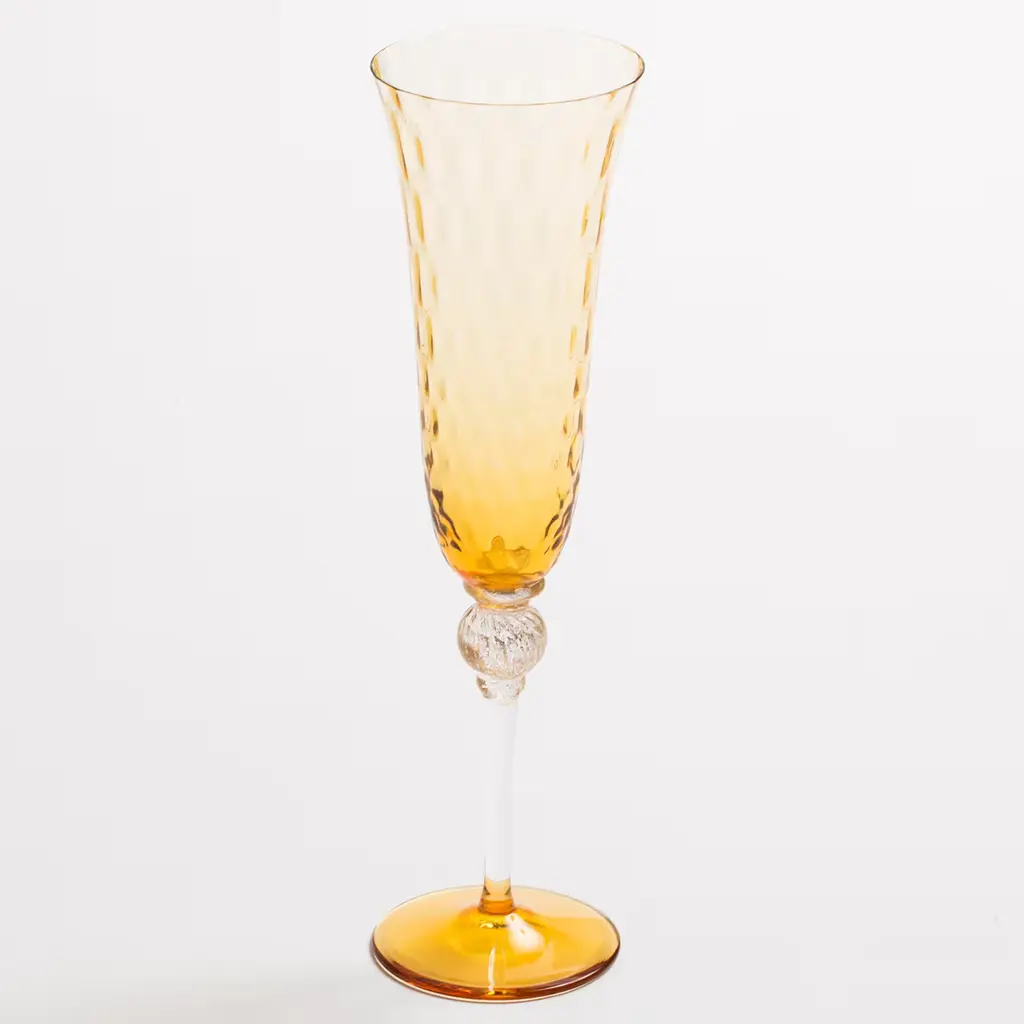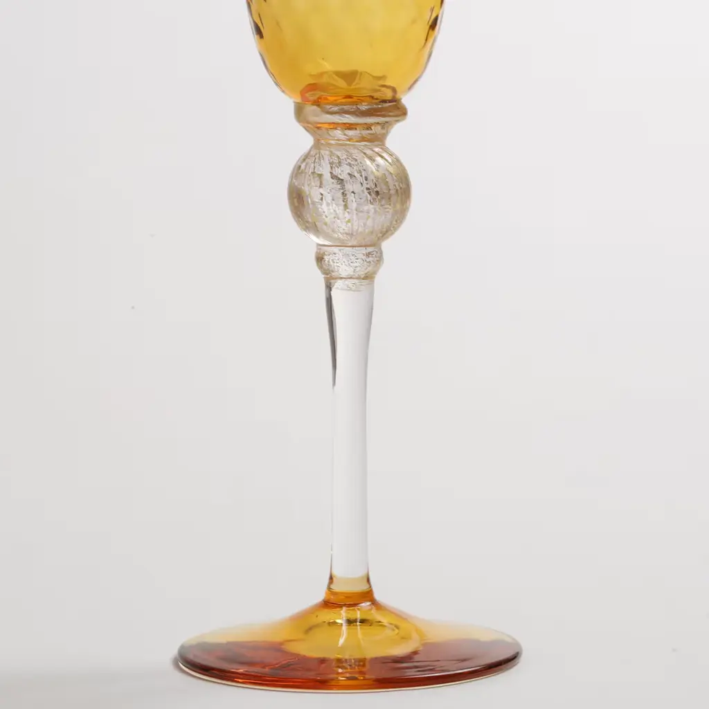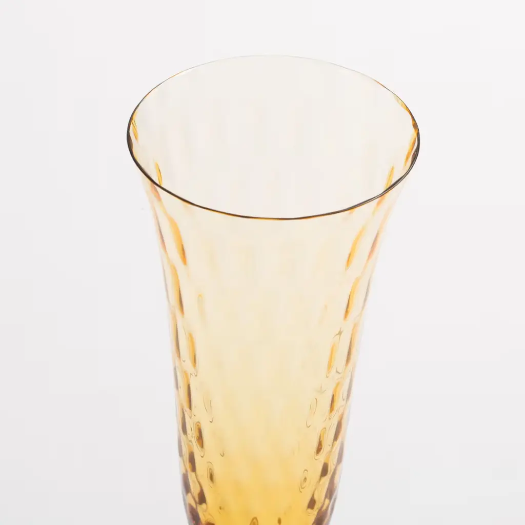 This exquisite flute has a crystal stem and a body in striking amber/gold. Its surface has a distinctive pattern that enhances its texture.