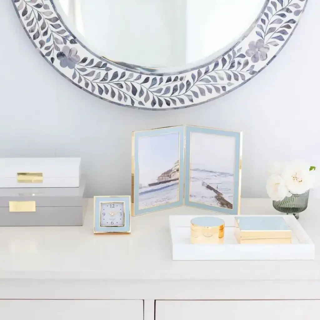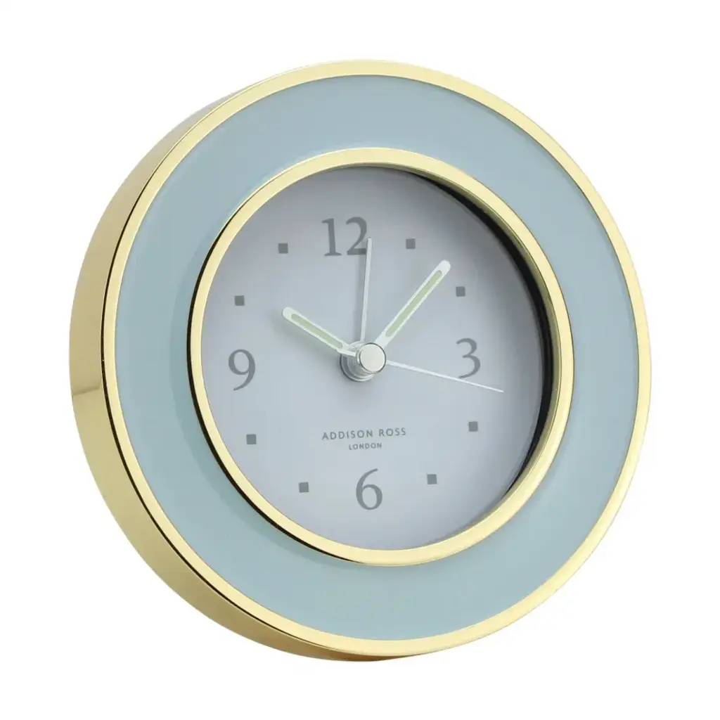 Our Powder Blue Enamel Alarm Clock is finished in gold with a luxury dove grey velvet back. This gorgeous desk or bedside square clock has an alarm and requires a AA battery. The movement is encased within a removable gold cover. The clock comes with 1 screw in leg.