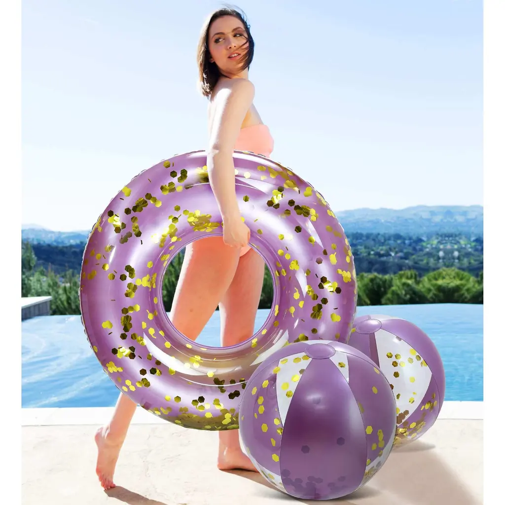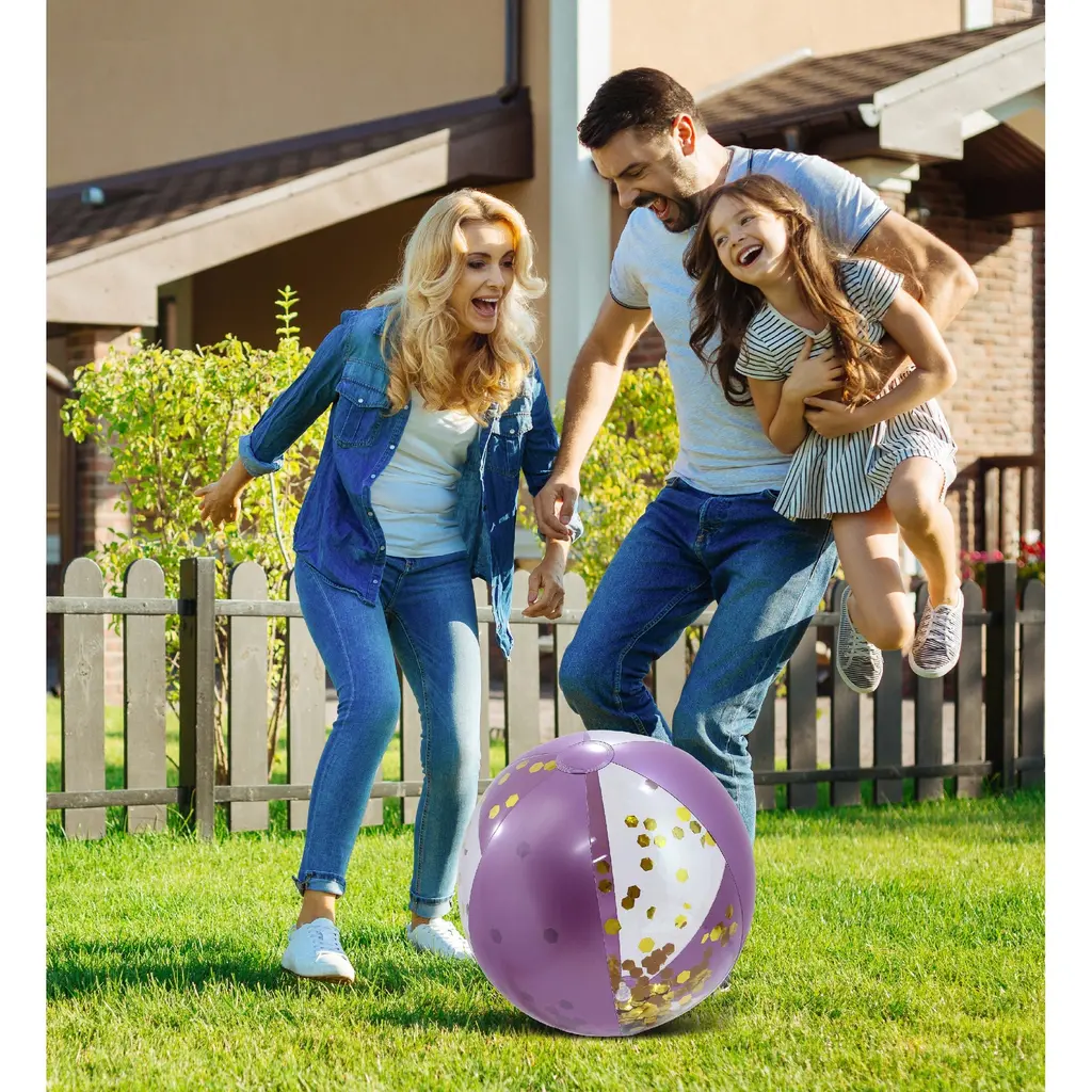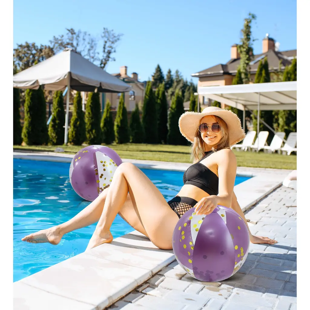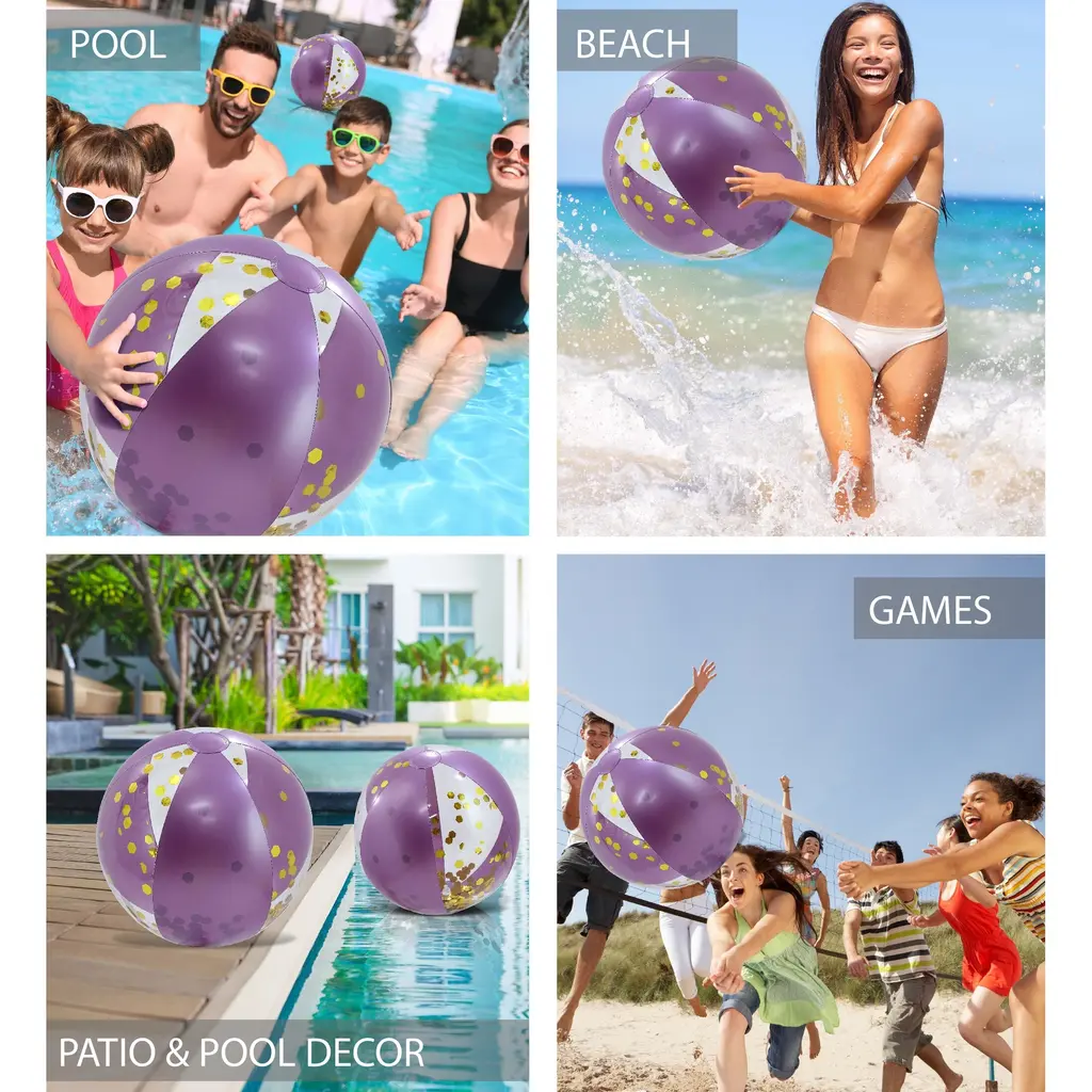 Enjoy the confetti beach ball pool accessories set, perfect decorations for summer pool parties and beach indoor and outdoor decor. Cute inflatable beach accessories to add fun and make your pool party more exciting. The set of stylish and vibrant Purple Gold confetti big beach ball bundle set is one addition to your summer wish list you cannot do without. Have a magical time under the sun with the sparkling purple gold confetti swimming pool toys. A set of Purple Gold Confetti Sparkle Glitter Beach Ball inflatables will make a BIG splash for a fun-filled summer. The unique design of the pool balls for swimming pool makes them great accessories for your pool party. Guaranteed to liven up any occasion, whether you are resting by the pool or looking for a tan. Play with the big beach balls and enjoy the sun. Each of the Purple Gold beach pool ball accessories are made of premium quality PVC vinyl materials, built to last for multiple uses. Crafted with UV and tear resistance to protect each large inflatable ball for the pool from color fading or cracking. Designed with eye-catching elegant purple gold vinyl filled with confetti. Use the beach ball toy in events and activities and the beach, pool, or lake. Includes 1 Purple Gold Sparkle Confetti Inflatable Ball Bundle that comes with 2 beach ball for kids. Use a pump or exhale into the quick valve system to inflate each pool ball within seconds. After a fun day, open the valve and squeeze the remaining air. The compact design makes the beach balls for girls and boys easy to store. Each large beach ball measures 16 inches.