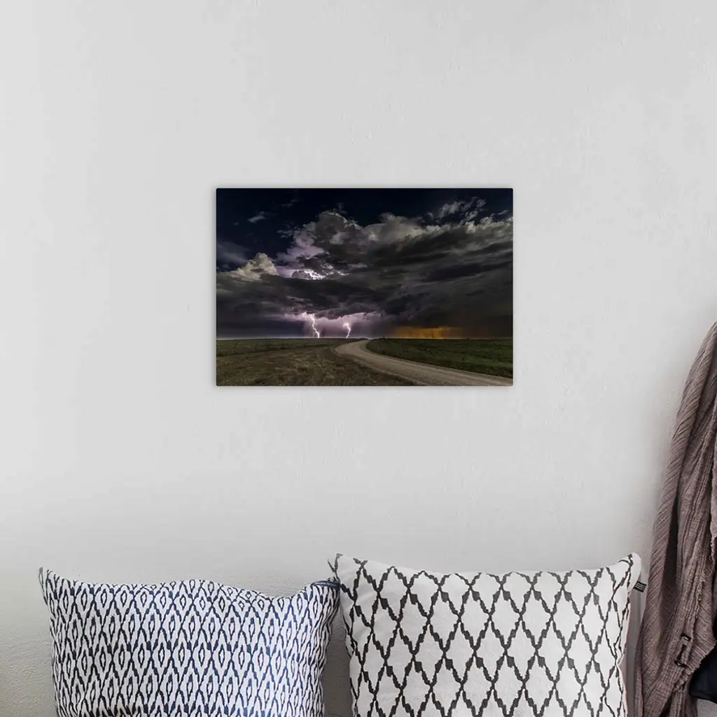 Dramatic clouds throw down bright purple bolts of lightning on a prairie landscape.