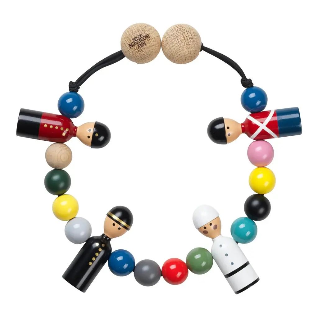 Make the pram ride even more fun with this lovely painted-beech, Kay Bojesen pram chain. The chain of coloured wooden balls and delicate little wooden figurines will definitely inspire little toothless smiles en route. The chain is easy to attach and fits all types of prams.