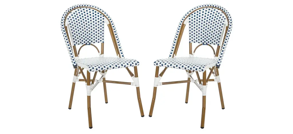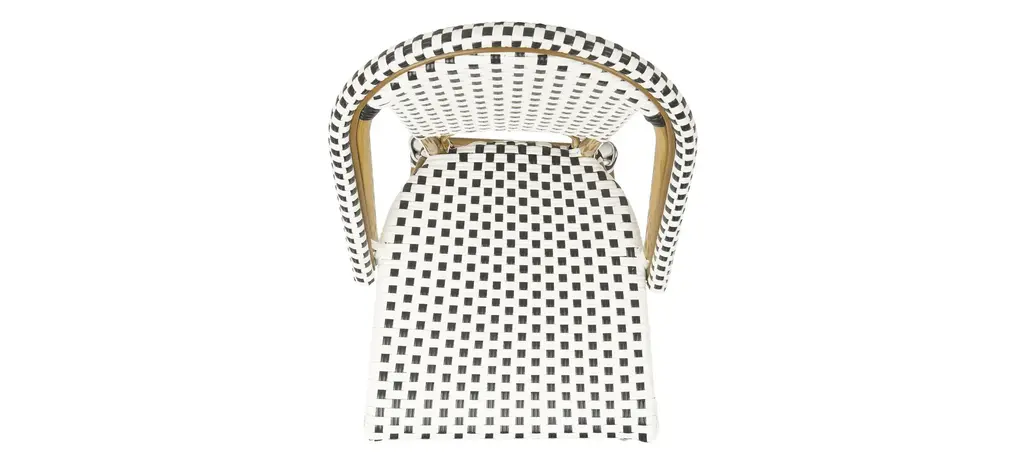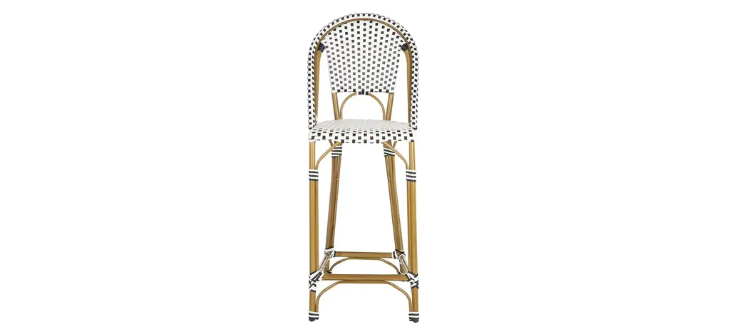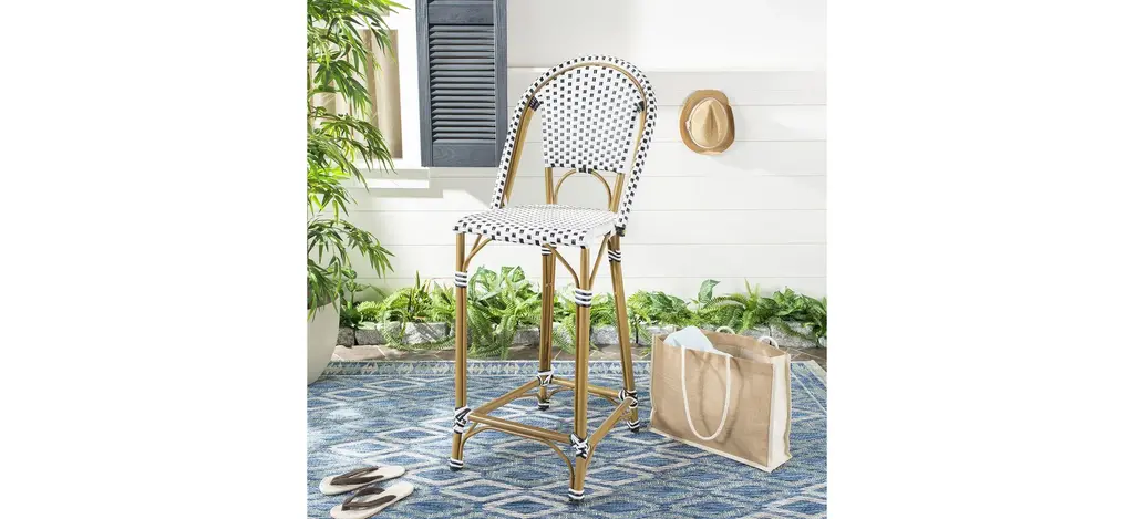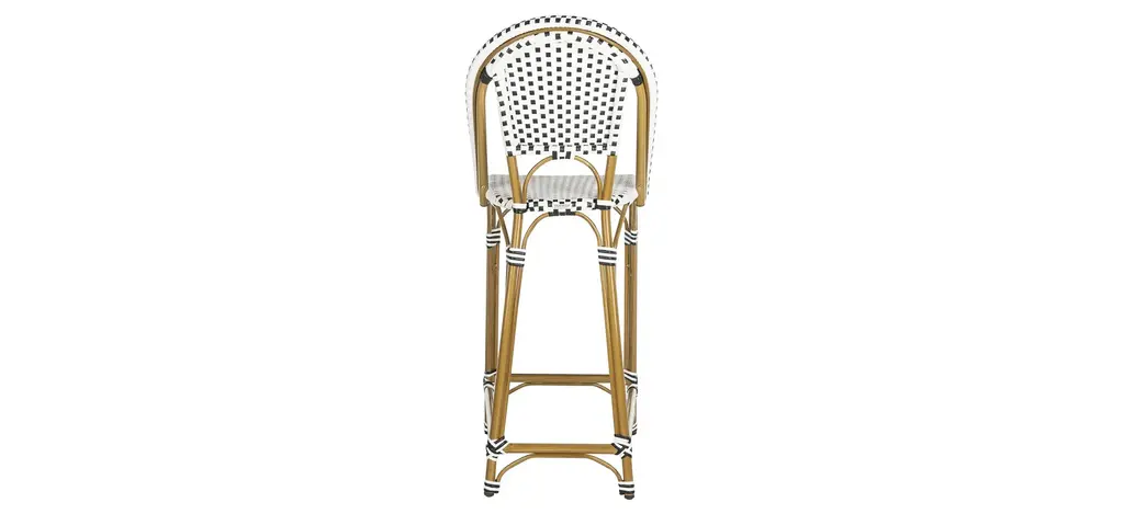 The beloved European Pramla stackable bar stool, assumes a coastal update in this black and white bar stool. The cheerfully woven PE wicker seat and back extends to the stylish wrap detailing on a classically styled brown frame. Come as a set of two.