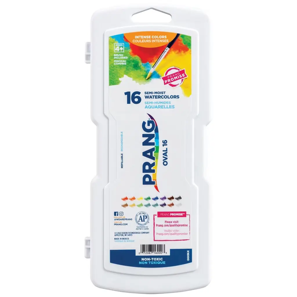 Prang® Semi-Moist Watercolor Paint Set, 16-Color Oval Pan with Brush | Ever the gold standard in watercolors, Prang® Watercolors offer smoothness, perfect blending, intense pigments and the best tone palette of its kind. Each Prang Semi-Moist Oval Pan Watercolor Set features extra-deep pans that can easily be replaced by refills, a wood-handled paintbrush and a strong white plastic case with built-in mixing area.