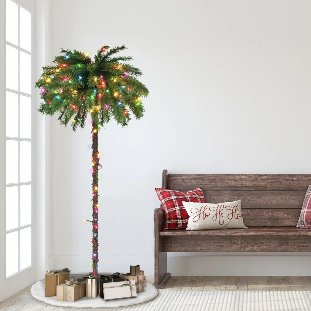 Create your own tropical oasis with this artificial palm tree. This synthetic palm tree brings the beach to your doorstep, no matter where you live. With 70 tips, it replicates the lushness of a real palm tree. Place it on your lawn, patio, or poolside, or even inside your home or walkways for a playful twist on the traditional Christmas tree. Lit with pre-attached UL-listed, incandescent clear lights, this palm tree eliminates the hassle of tangled cords and instantly adds a festive ambiance to your space, no matter the season. Let the tropical vibes transport you to paradise. Product Features: Pre-lit with 150 multi lights Bulb size: mini Bulb type: incandescent 70 tips Black wire cord Additional Product Features: Artificial palm tree with base Flame retardant and non-allergenic If one bulb burns out, the rest will stay lit UL-certified and approved For indoor use only Assembly required Dimensions: 6’ high (from the base of the stand to the top of the tree) 36” base diameter (at the widest point) Material(s): PVC/resin/MGO2/glass bulbs/wire Note: Branches are compressed for shipment, and need to be fluffed out upon arrival to look like the photo.