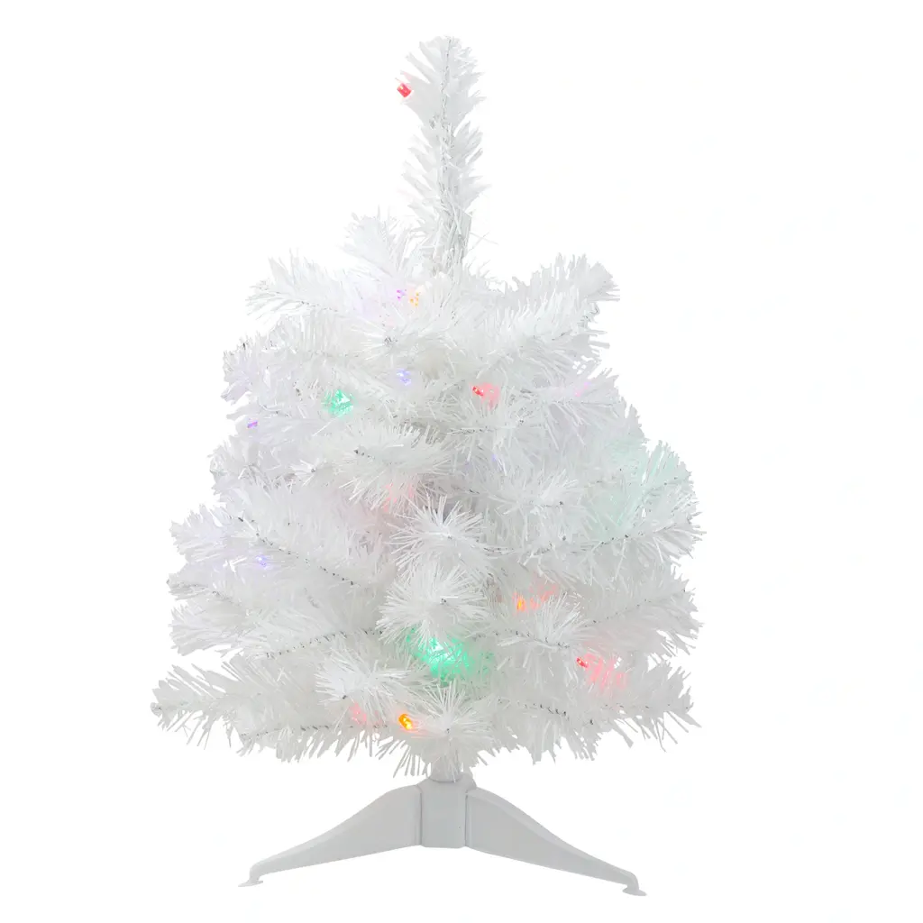 This gorgeous tree is sure to make your holiday season merry and bright. It's lights are sure to light up not only the white branches of this tree, but also your home decor. Your family and friends will be delighted to see this durable and timeless addition to your holiday decor. Product Features: Pre-lit with 20 multi-color LED lights Multi-color consists of pink, purple, red, green, blue and orange bulbs Bulb size: concave wide angle 65 tips 2" wide tapered tips 31.5" white lead cord Additional Product Features: Medium profile tree LED lights use 90% less energy Durable non-glass replaceable bulbs Cool to the touch Light sets on tree are UL certified and approved for indoor or outdoor use, however, the tree itself is recommended for indoor use only If one bulb burns out, the rest will stay lit For indoor use only Comes with replacement bulbs 2-piece easy assembly (including stand) Comes with a FREE plastic tree stand Wire gauge: 22 120 volts, 60 hertz, .023 amps, 2.76 watts Dimensions: 18" high (from the base of the stand to the top of the tree) Distance from floor to the first row of branches: 3" 11" base diameter (at the widest point) Material(s): PVC/metal/plastic bulbs/wireNote: Branches are compressed for shipment, and need to be fluffed out upon arrival to look like the photo.