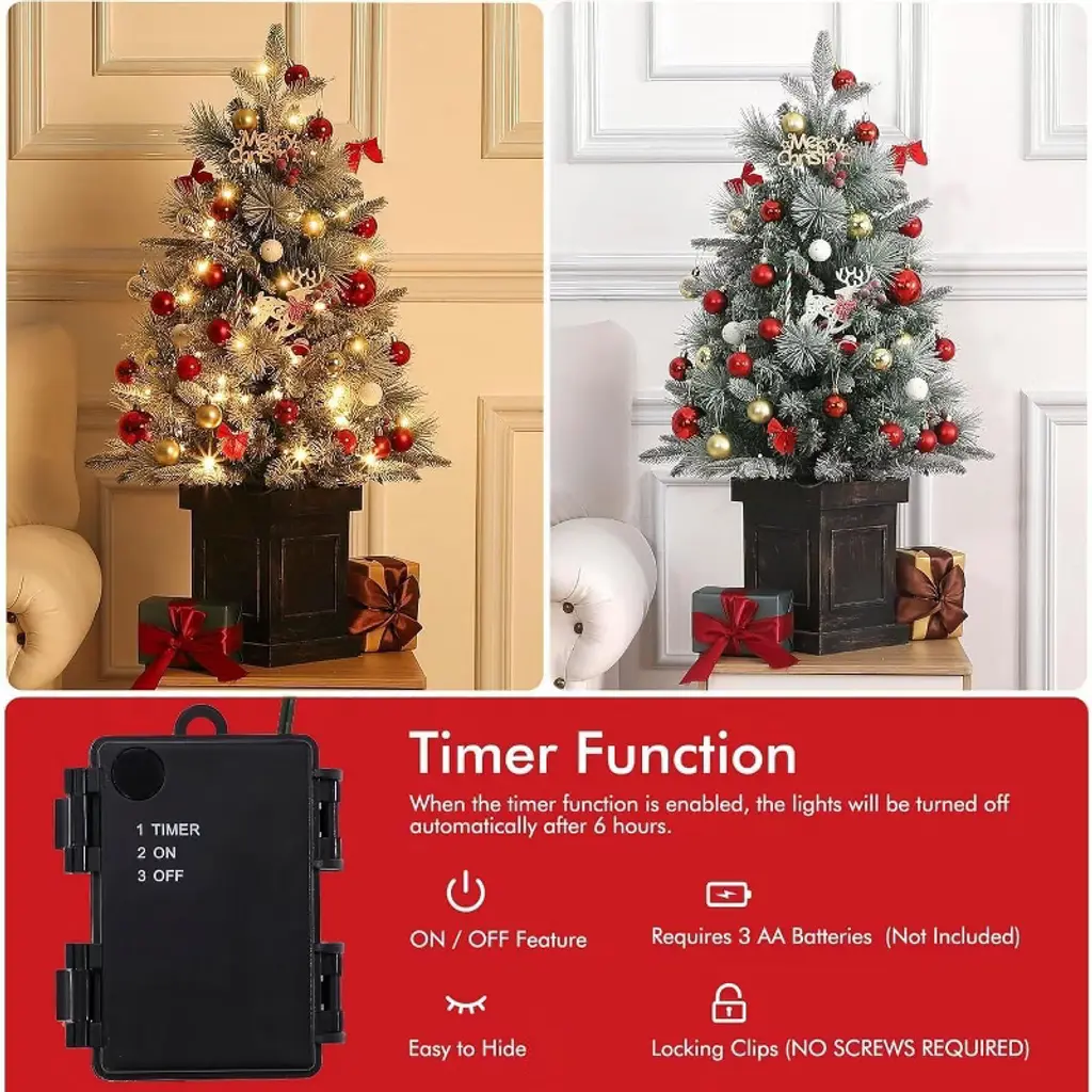 Realistic Appearance: Experience the beauty of early winter with a frost-covered landscape and lifelike cedar tree design, offering a refreshing perspective from both near and afar; Perfect for any holiday setting Pre-lit Design: Adorned with 78 warm white LED lights, this 3 ft small Christmas tree radiates brightness, reminiscent of a starry sky; Equipped with a 16-hour automatic shut-off timer for added convenience Stable Base: The lantern base is filled with cement to lower the prelit xmas tree's center, providing exceptional stability and balance to prevent tipping; Ideal for homes with kids and pets Premium Material: Crafted from hypoallergenic, and fire-resistant PVC materials, this mini christmas tree with warm white lights ensures and durability and longevity in use; Don't need to worry about wear and tear Easy to Assemble: The snow flocked artificial christmas tree features hinge-style that easily unfold with a gentle pull, allowing for quick and convenient setup