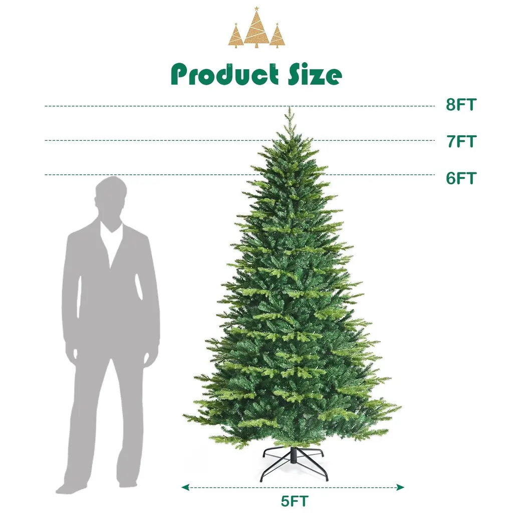 SpecificationsKey Features● Ulti-purpose Christmas Tree: The pre-lit Christmas tree, which measures 6 feet tall, is characterized by its elegant layers of branches. From a distance, it looks as natural as a real cedar tree. Except for LED lights, there's no other ornaments on it. So you can decorate it with family and friends according to your imagination. ● Leafy Branch Tips in Two Types: The total amount of Christmas tree branch tips is 1740, including 786 PVC tips and 954 PE tips. All of them are made of odorless, non-toxic and recyclable new material. And the dark green PVC tips and light green PE tips integrate with each other very well, making the tree full-bodied and dense in appearance. ● 8-layer Color Changing LED Lights: This tree is equipped with 420 LED lights that are divided into 8 layers. If lights of one layer were burnt out, the lights of other layers wouldn't be affected and keep working. Therefore, you can enjoy the cool LED lighting show incessantly during your Christmas party. ● Multifunctional Remote APP Control: These LED lights with 16 colors support remote APP control provide great convenience in daily use. You can adjust light brightness, light color, glittering speed to customize your preferred lighting mode. Or you can choose a preset lighting mode among 15 choices. Set lighting time from 4 hours to 16 hours according to your needs. ● Stable Structure with Easy Assembly: This LED Christmas tree is supported by a robust metal stand to ensure its stability. With separated sections and hinged branches, the tree can be put together and expanded without much efforts. After exciting Christmas parties, you can detach the tree into 3 sections to save storage space.Overview-An eye-catching 6ft/7ft/8ft tall Christmas tree for residential and commercial decoration -Leafy and full-bodied Xmas tree consists of 1740/2324/2956 PE and PVC branch tips -100% new PE and PVC tips are odorless, nonflammable and non-toxic -420/540/670 color changing LED lights are able to create different atmospheres -App controlled lights support you to customize your wanted lighting modes -Hinged branches and separated sections simplify assembly processes -LED lights of each layer work independently and won’t be affected by other lights
