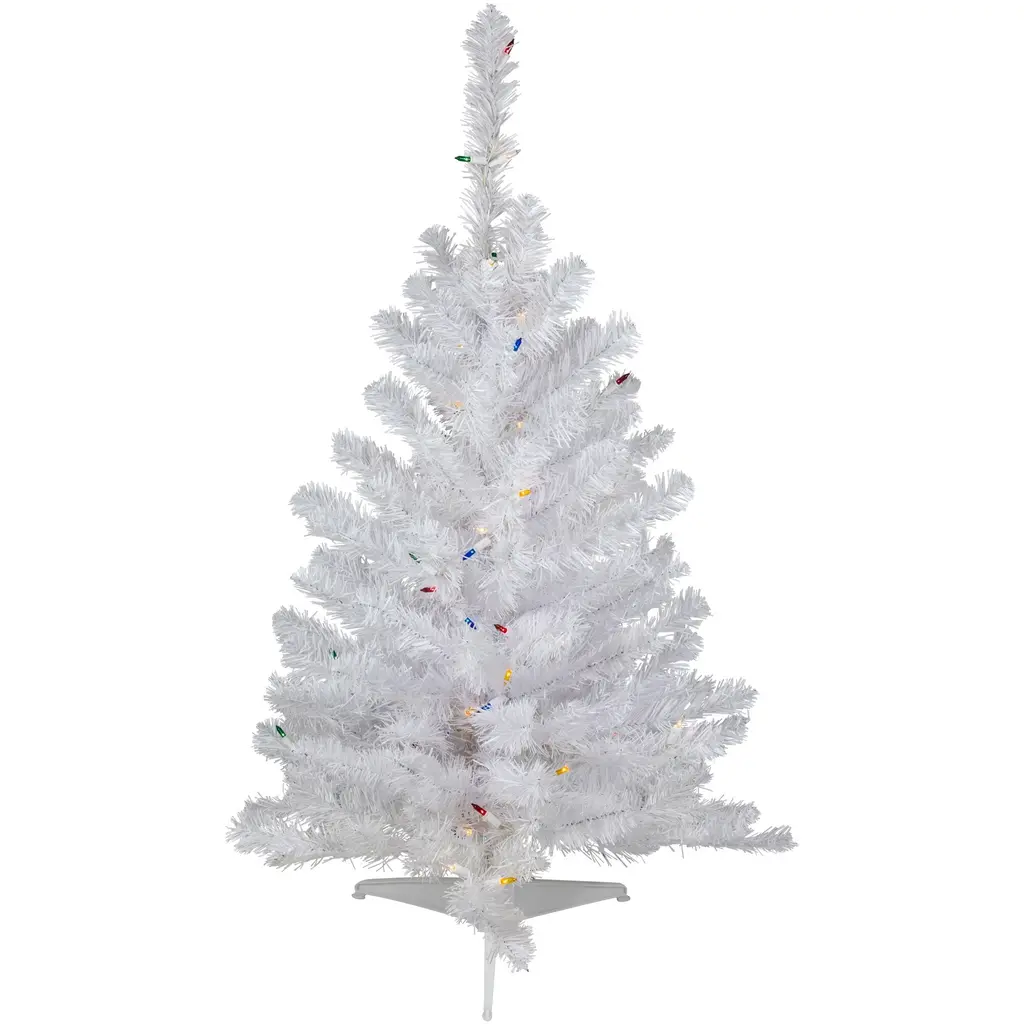 Sure this beautiful tree will make your holiday season merry and light. Its lights are sure to illuminate not only this tree's branches but also your home décor. Your family and friends will be delighted to see this enduring and everlasting addition to your holiday decor. Product Features: Pre-lit with 100 multi-color lights Multi-color consists of clear, red, green, blue and yellow bulbs Bulb size: mini 145 tips 2" wide tapered tips 35" white lead cord Additional Product Features: Medium profile tree Super bright bulbs Light set on tree is UL listed for indoor or outdoor use, however the tree itself is recommended for indoor use only If one bulb burns out, the rest will stay lit Comes with replacement bulbs 2-piece easy assembly (including stand) Comes with a FREE plastic tree stand Wire gauge: 22 120 volts, 60 hertz, 0.34 amps, 40.8 watts Dimensions: 3' high (from the base of the stand to the top of the tree) Distance from floor to the first row of branches: 5" 23" base diameter (at the widest point) Material(s): PVC/metal/glass bulbs/wireNote: Branches are compressed for shipment, and need to be fluffed out upon arrival to look like the photo.