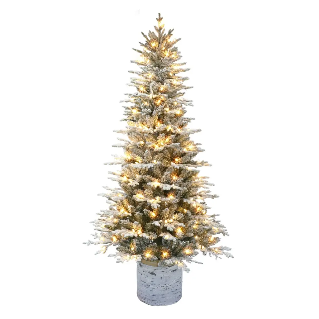Pre-Lit Potted Arctic Fir Flocked Artificial Christmas Tree - 6’ - Warm Lights - 6 Foot - Green - 6 Foot