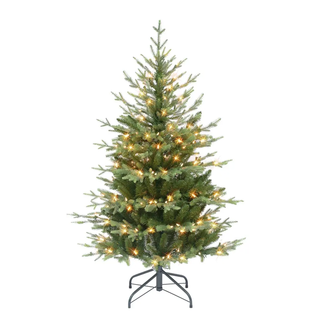 Elevate your holiday celebrations with this pre-lit slim balsam fir Christmas tree, designed to bring natural beauty and festive charm to your home. Features lush green pine needles and a graceful conical shape. Pre-lit with 200 clear incandescent mini lights, it instantly fills your space with a warm, radiant glow. This slim profile tree is perfect for smaller spaces while still offering a stunning holiday display. Product Features: Pre-lit with 200 clear lights Bulb size: mini Bulb type: incandescent 153 tips Black wire cord Additional Product Features: Slim profile tree Flame-retardant, hypoallergenic, and needle-shed resistant UL-certified and approved For indoor use only Comes with a metal tree stand Assembly required Dimensions: 4.5’ high (from the base of the stand to the top of the tree) 34” base diameter (at the widest point) Material(s): PVC/metal/glass bulbs/wire Note: Branches are compressed for shipment, and need to be fluffed out upon arrival to look like the photo.