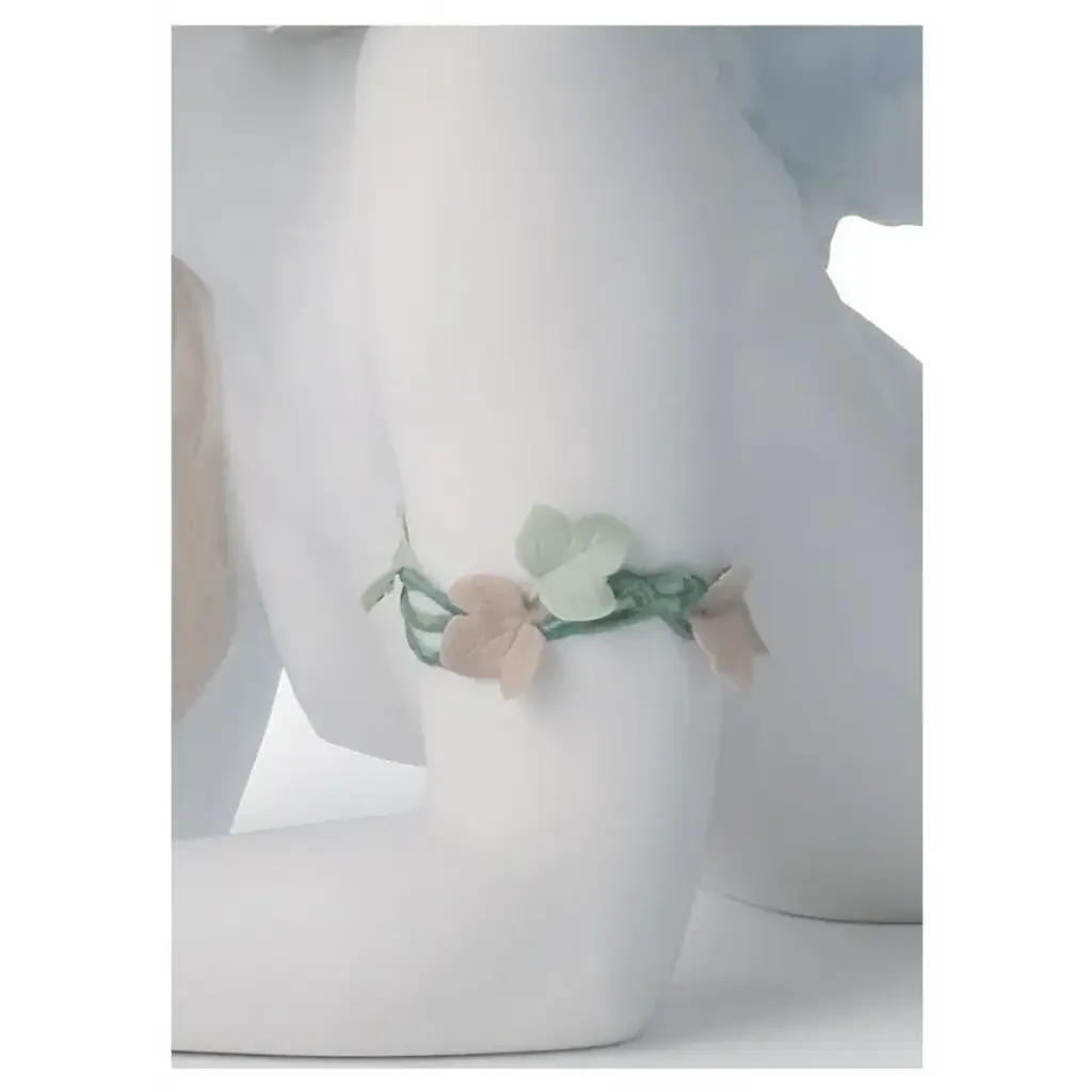 Porcelain angel figurine in the shape of a woman lying down with blue wings decorating her hair and arm with small flowers. An iconic Spanish brand, Lladro is a world leader in the creation of porcelain art. Started by brothers Juan, Jose and Vicente Lladro in 1953, the ceramic figurines were initially inspired by the works of great European manufacturers like Meissen and Sevres. Over time, a unique style was forged, consisting of elongated lines, a revolutionary single-firing method, and soft pastel tones.
