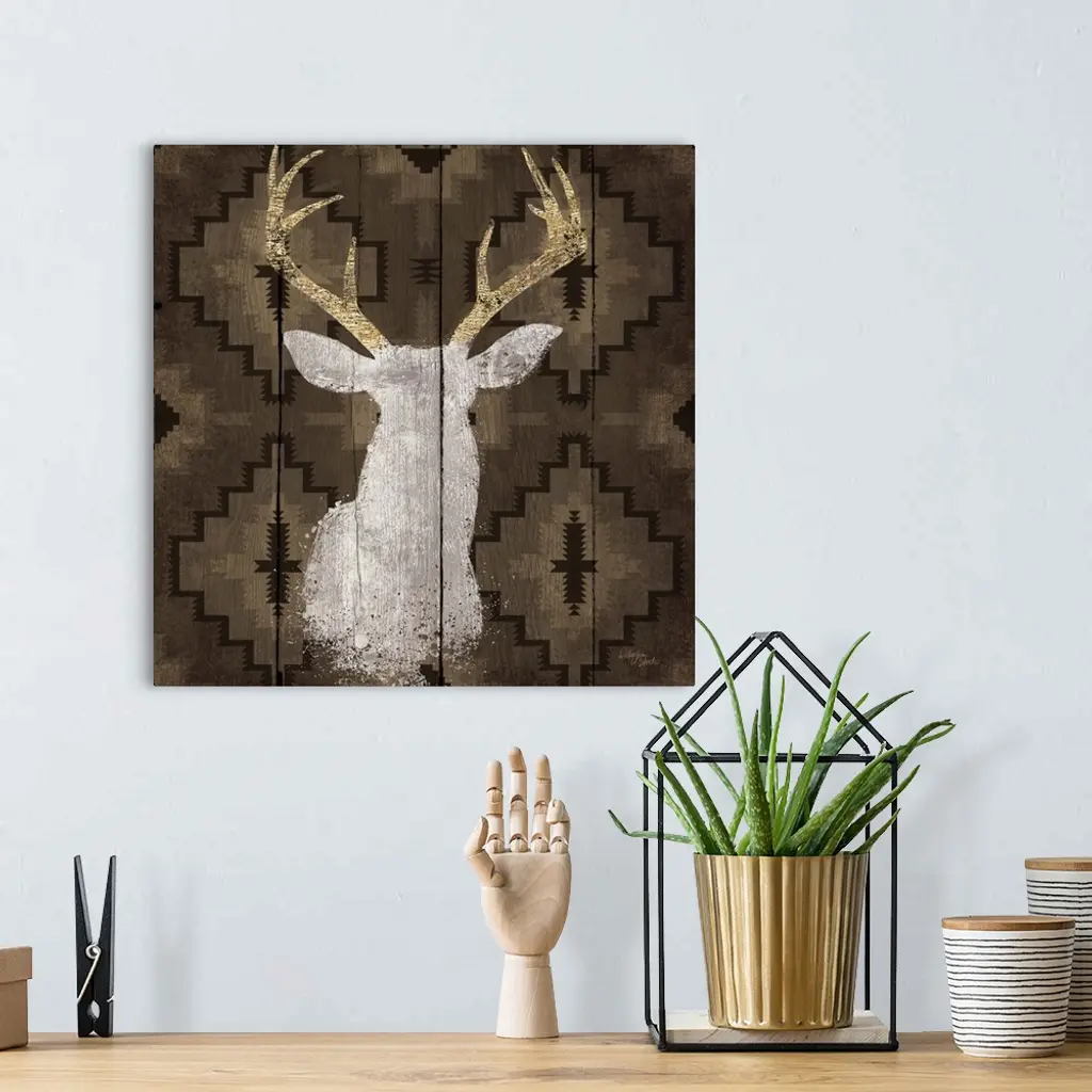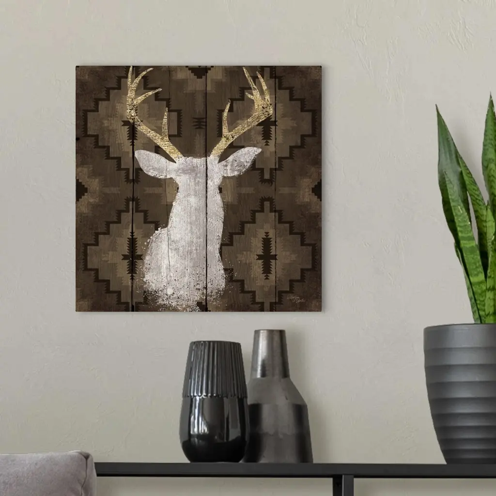 Stag head silhouette against a rustic looking native american pattern perfect for a lodge in the woods.