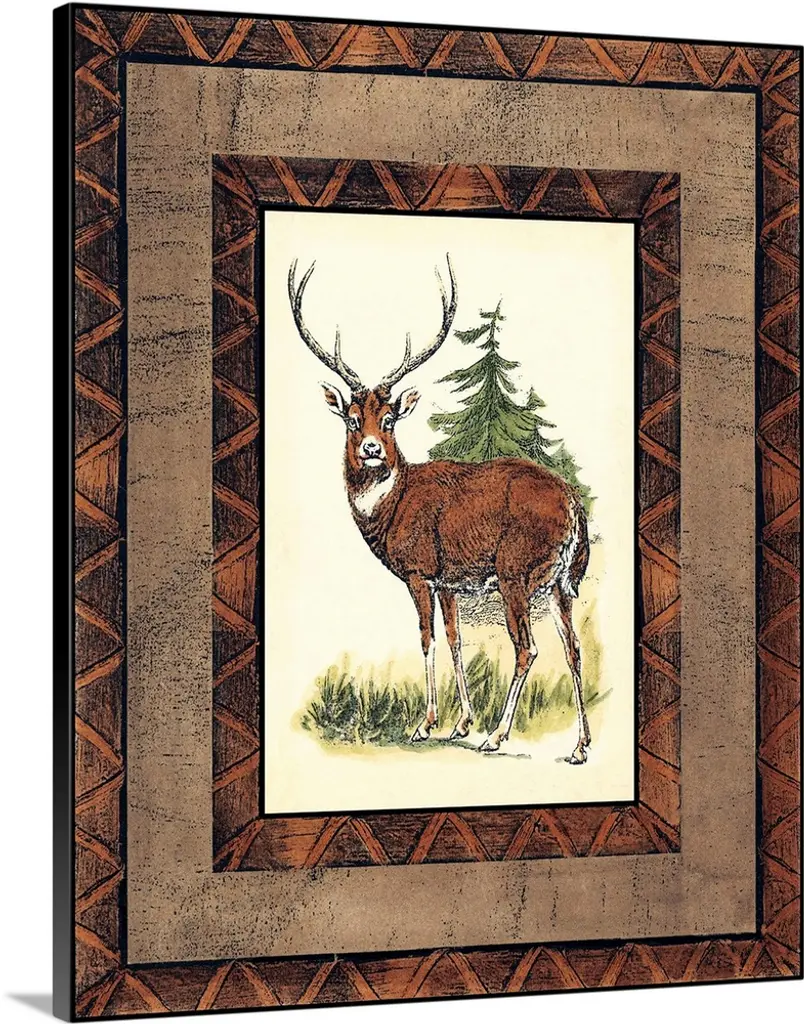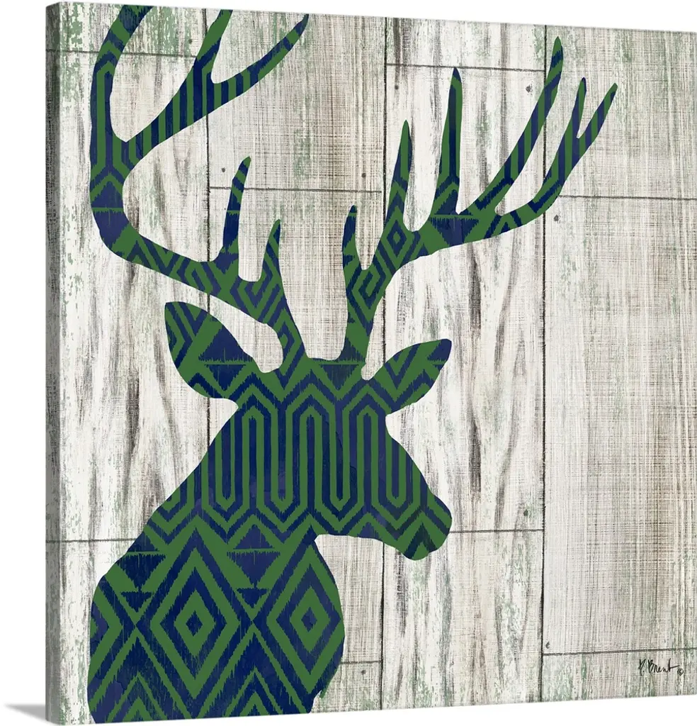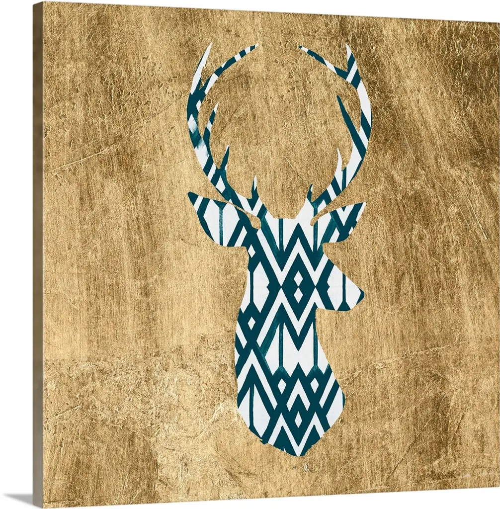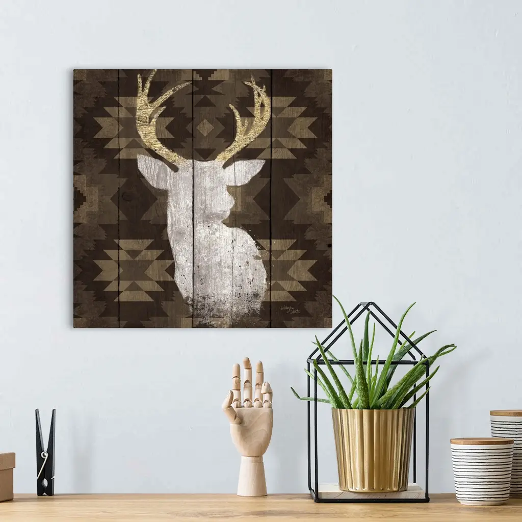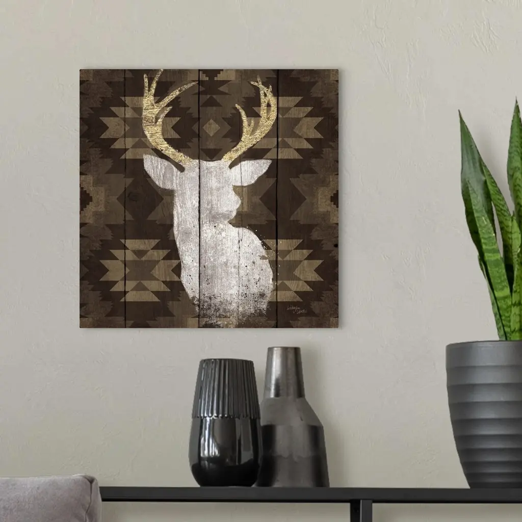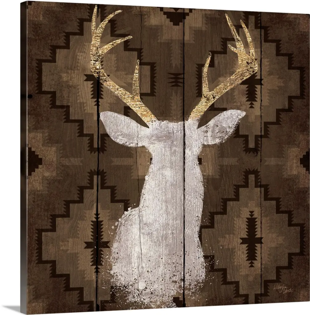 Stag head silhouette against a rustic looking native american pattern perfect for a lodge in the woods.