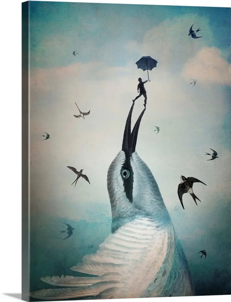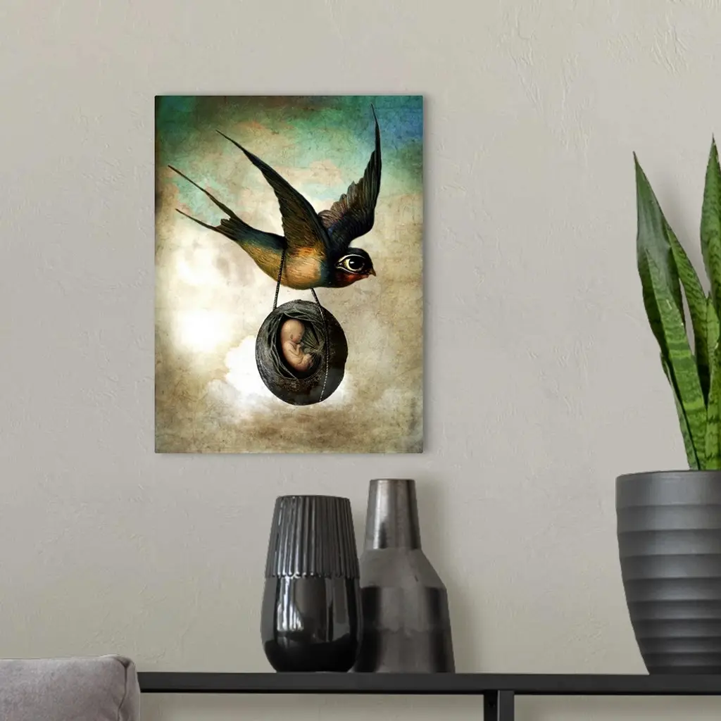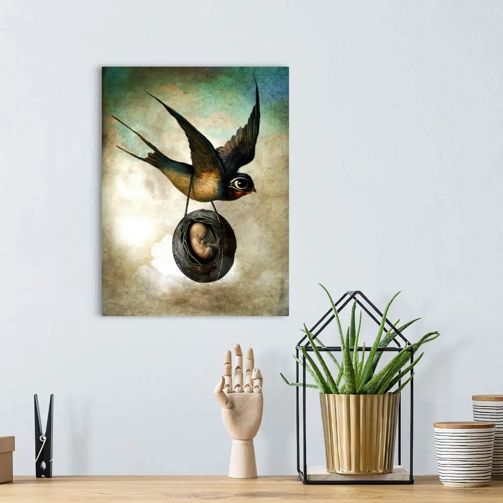 A bird with an over-sized eye carrying a husk with a unborn human baby in it.