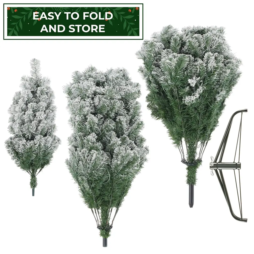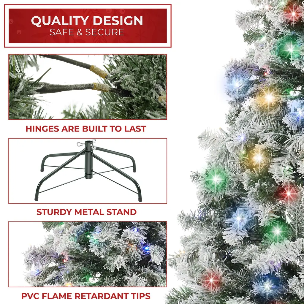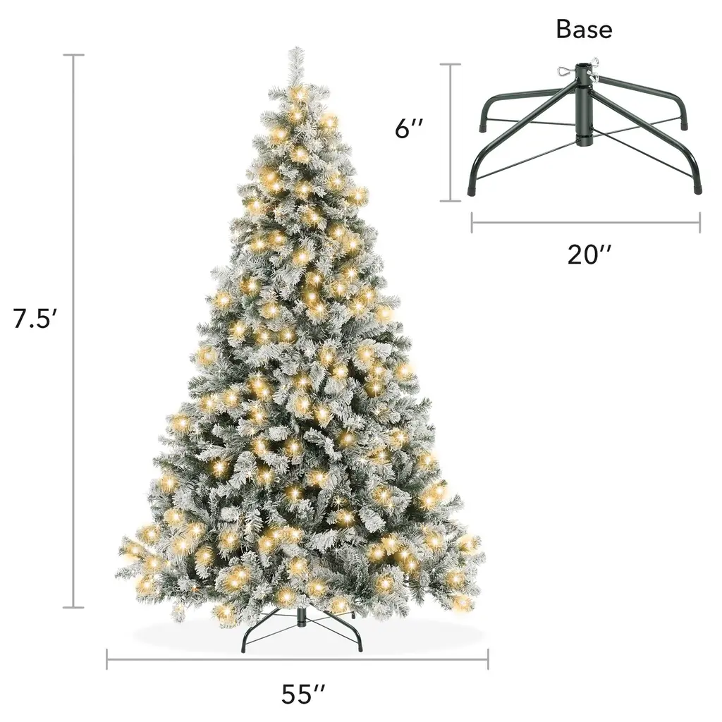 Extremely realistic: This true-to-life tree's snow flocked craftsmanship and detailed design make this the most realistic artificial Christmas tree in its class. Its full lush shape and snow flocked branches are a perfect backdrop for your holiday decorations.White and Multicolor LED lights: This unique snow flocked tree is two trees in one and will make your holiday decorations pop and sparkle. Pre-strung branches with white and multicolor lights switch between 9 different modes creating a festive glow.Premium quality: Designed and constructed using the newest manufacturing technology and highest-quality materials, our holiday trees create the illusion of genuine, fresh-cut, spruce trees. Faux (fake) Christmas trees are the best value, as they are affordable and will last for holiday seasons to comeBuilt to last: Constructed with premium grade materials, branches and needles are flame retardant and non-allergenic. Features hundreds of individually crafted, pre-attached, hinged branch tips with durable metal hinges. Includes foldable metal base.Easy assembly and takedown: Put your tree together in three easy steps by simply stacking each pre-labeled section to the foldable base and then arranging the hinged branches. For its most lush and full form, please set aside 30 - 45 minutes to properly shape the tree. Simply pull down and arrange the branches to your preference, with the included protective gloves. If you are looking for a touch of luxury this Christmas, this is the tree you’ve been looking for! This unique snow flocked tree is two trees in one and will make your holiday decorations pop and sparkle. Pre-strung branches with white and multicolor lights switch between 9 different modes including: Warm white lights on, Colorful lights on, White slow fade, Colorful slow fade, Warm lights slow fade to colorful, Warm lights flash, Colorful lights flash, White light and colorful flash, Warm lights to colorful flash (fast). A perfect addition to your home or office for Christmas and other festive events. This true-to-life trees' craftsmanship and detailed design make this the most realistic pre-lit artificial Christmas tree in its class. Built using the newest manufacturing technology and highest-quality materials, our holiday trees create the illusion of genuine, fresh-cut, green spruce trees. Faux (fake) Christmas trees are the best value, as they are affordable and will last for holidays to come. The branches and needles are both flame retardant and non-allergenic. This tall Christmas tree stands straight on its foldable metal base. Integrated rubber feet help keep the tree in place and your floors scratch-free. Set up in 3 easy steps; place the base, stack each pre-labeled section, and arrange the branches using the included protective gloves. Specifications: 6FT - 6' High x 43" Diameter, Hinged Branches: 732, 350 UL Lights with 9 modes, Stand: 6" High x 20" Diameter 7.5FT - 7.5' High x 55" Diameter, Hinged Branches: 1346, 550 UL Lights with 9 modes, Stand: 6" High x 20" Diameter