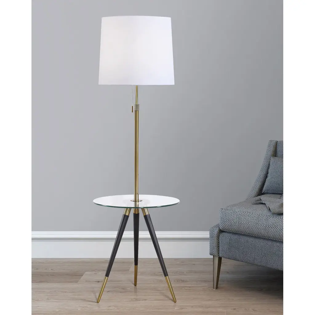 Highlight your sense of adventure with this tripod-style lamp. A unique design that blends classic and contemporary flavors gives this lamp a fun look, adding character to any room. This easy-to-assemble lamp features an elegant and sturdy tempered-glass tabletop tray for extra convenience.Modern Classic Tripod floor lamp with glass trayAdjustable to 68 inches high maxLarge 20 inches diameter 10mm tempered glass trayMade of metal tripodClassic dark bronze/antique brass two tone finishWhite fabric 17 / 15 x 15 inches high lamp shadeSwitch Type: Pull ChainUses one E26 medium based 150W Max or equivalent LEDAssembly requiredUL Listed