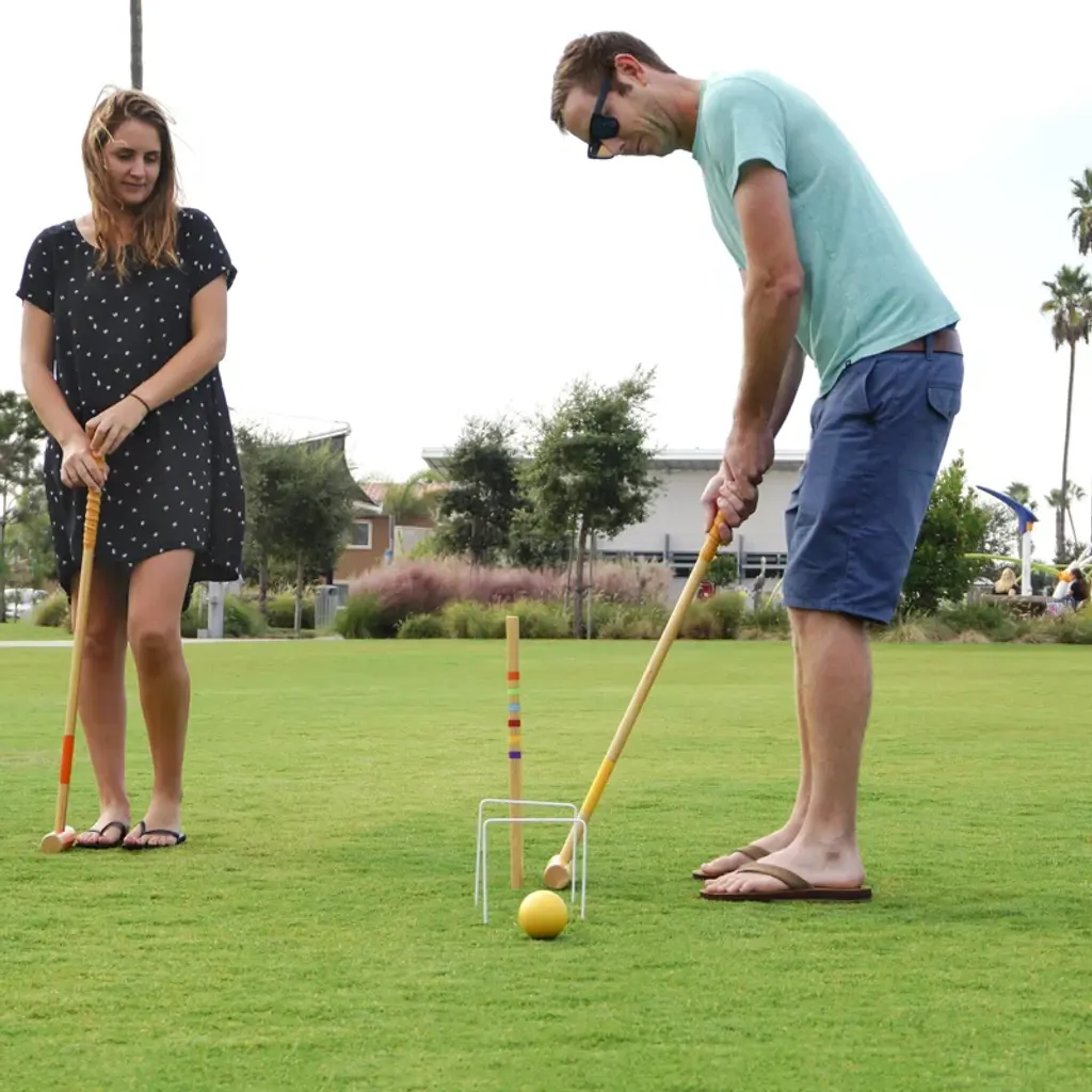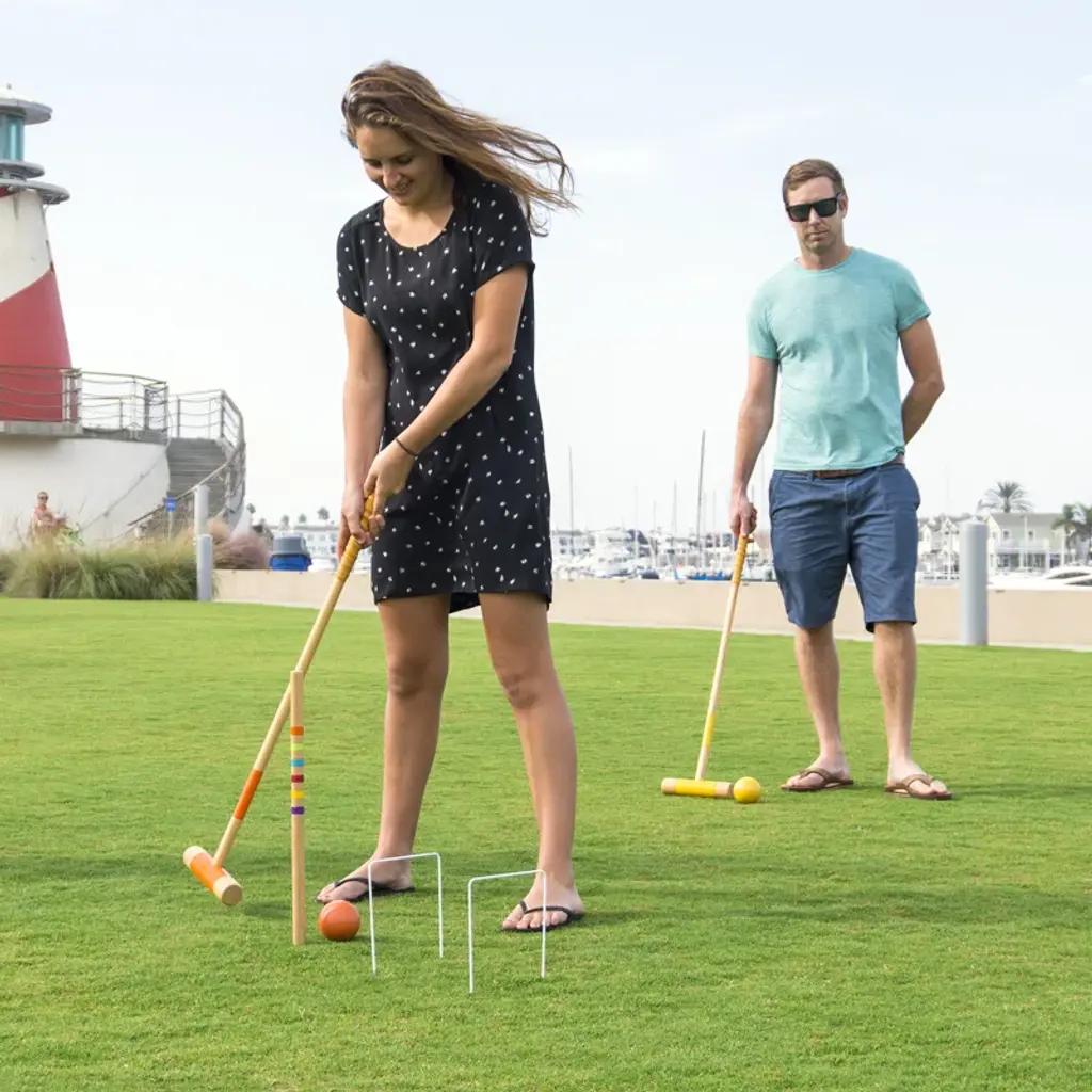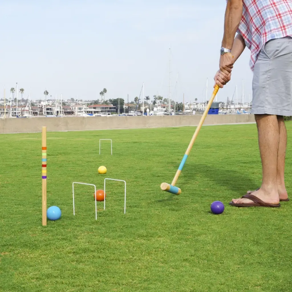 Elevate your outdoor gatherings with this premium croquet set. Crafted from solid wood and durable plastic, this set is built to last. It includes everything you need for a friendly competition with up to 6 players. The water-resistant, UV-resistant, and mold/mildew resistant design ensures this set will withstand the elements. Plus, the included carrying case makes it easy to take on the go. Gather your friends and let the games begin!