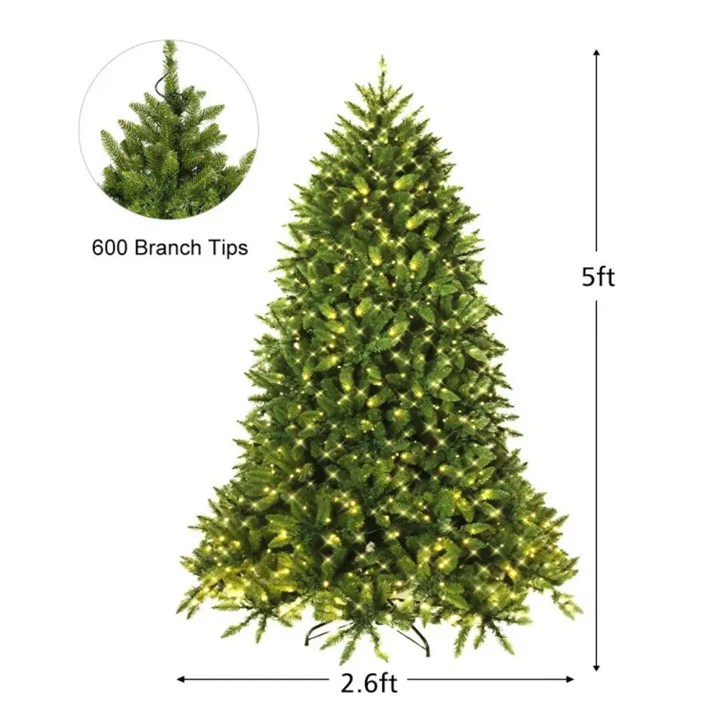 SpecificationsKey Features● Warm LED Lights and 8 Lighting Modes: With warm and bright LED lights that bring a festive glow to your home. These LED lights have traits of energy-efficient and long-lasting. And the lights features 8 flash modes, so you can choose different modes to create different atmospheres and effects as needed. ● Dense and Realistic PVC Blades: The leaves of this Christmas tree are made of high-quality PVC, this material is safe and non-toxic and will not harm you and your family's health. The 600 branch tips help emulate a real Christmas tree. And our tree only includes lights, you can also add extra decorations as you like. ● Hinge Design for Easy Assembly: Christmas tree is separated into two hinged sections and one metal base which allows for easy assembling, dismantling and storing. To finish the assembly of this tree just requires few steps. ● Sturdy Metal Frame: Christmas tree uses metal stand instead of a cheap plastic stand. The metal stand can absolutely provide stronger support for the Christmas tree and ensure stability. The added non-slip pads on the end of the stand protect your floor and the green painted iron pipe trunk makes this tree look more simulated. ● Perfect for Holiday: Christmas tree will add a festive atmosphere. Perfectly decorate your home, bedroom, living room, balcony and children's room. PVC material enhances water resistance and metal stand to help the tree keep stable. This beautiful holiday essential will brighten up any room to create a beautiful look.Description
