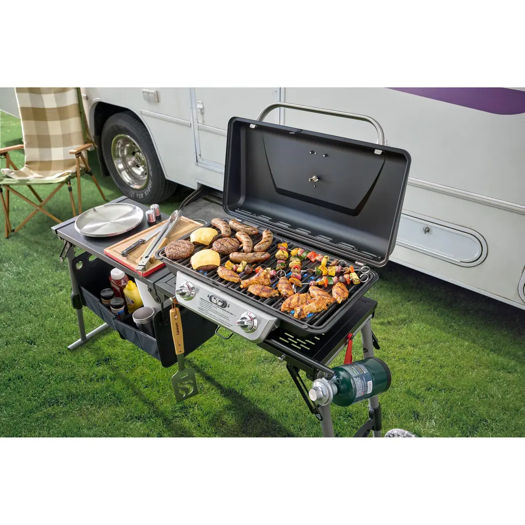 The Cuisinart Prep 'n Go Folding Gas Grill is designed for ultimate portability, food prep, storage, and cooking all in one. When folded, the grill measures 27.8" L x 22.3" D x 15.1" H, making it the most compact tri-fold grill available—saving valuable trunk space for other essentials . Cook up to 17 burgers at once with 285 sq. in. of cooking space on durable cast iron grates. With 18,000 BTUs of cooking power, this grill is perfect for camping, tailgating, or any on-the-go grilling. The large 24" x 12" prep table eliminates the need for a separate table, giving you plenty of room for food prep and staging. A removable storage tote underneath the prep area keeps your party essentials like plates, bowls, and utensils organized, and folds away with the grill when you're done. The wheels and built-in handle allow for easy mobility, so you can easily wheel the grill to your campsite, tailgate, or backyard gathering. Features: COMPACT FOLD: Grill folds down to just 27.8" L x 22.3" D x 15.1" H, making it the most compact tri-fold grill available. FOOD PREP AREA: Built-in 24" x 12" prep table means no extra table is needed for food prep and staging. COOKING PERFORMANCE: Cast iron grates offer 285 sq. in. of cooking space with 18,000 BTUs for great grilling performance. No need to sacrifice performance for portability! ULTRA PORTABILITY: With a built-in handle and wheels, this portable grill is ready to be wheeled to wherever you need. STORAGE TOTE: Includes a removable storage tote for your condiments and other grilling essentials. Folds away with the grill for easy transport.