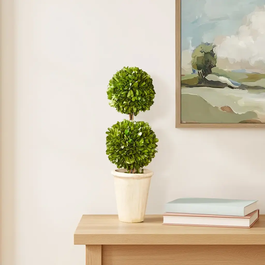 Introducing a timeless piece of décor: a double ball topiary featuring two preserved boxwood balls, elegantly placed in an ivory-washed terra cotta pot. This topiary is a testament to superior craftsmanship, using only the finest quality materials. The real boxwood used has been meticulously preserved to ensure its lush green vibrancy remains for years to come. Available in two distinct sizes, 20 inches, and 30 inches, it's a versatile addition that promises to elevate any space with its natural elegance.