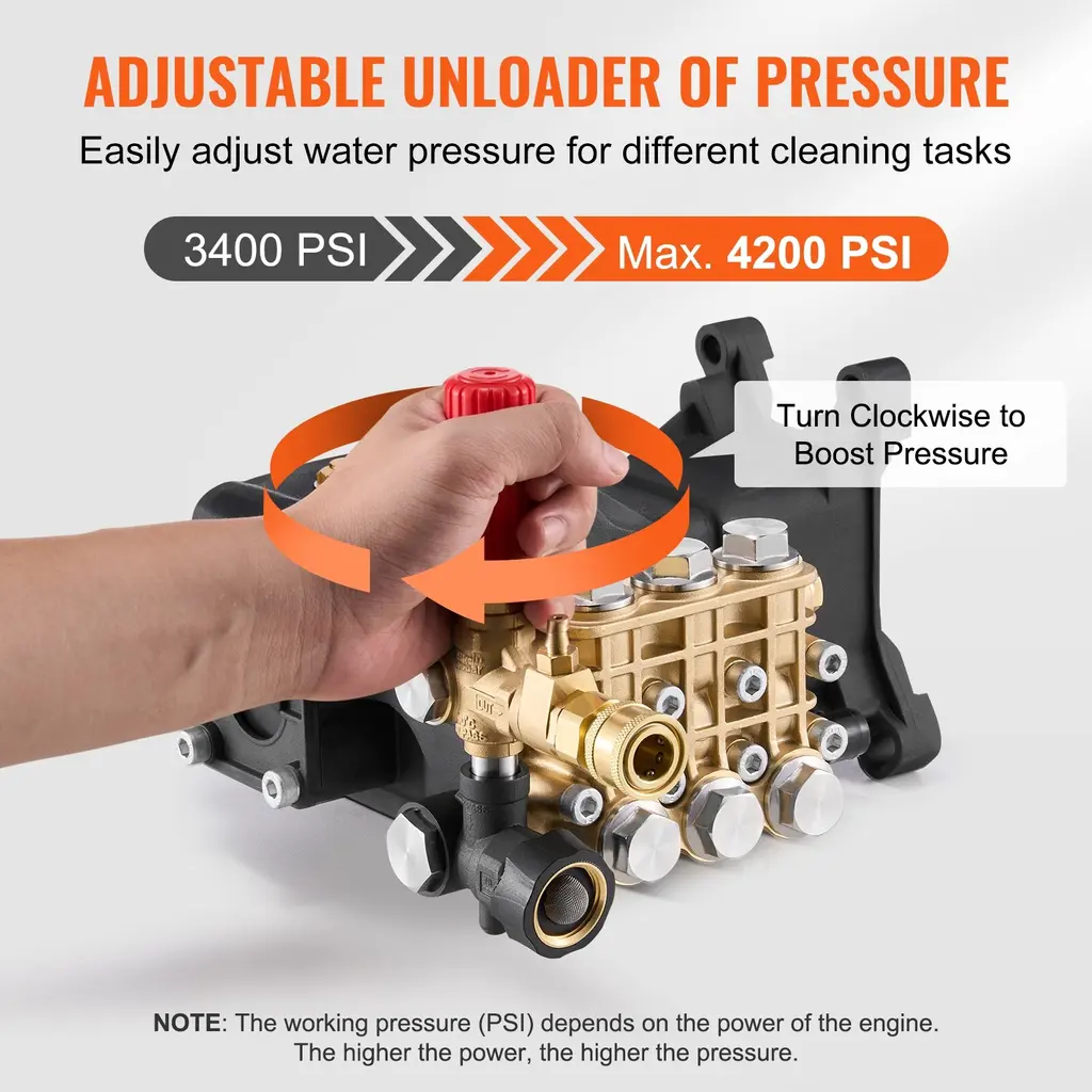 High-Efficiency Cleaning Power: For 4400 PSI, 4.4GPM option: Our pressure washer pump delivers up to 4400 PSI of powerful water pressure with a maximum flow rate of 4.4 GPM, ensuring fast completion of tasks ranging from household cleaning to light industrial jobs. (Recommended working pressure: 4000 PSI for typical residential and light industrial cleaning and to extend pump life.) For 4200 PSI, 4.2GPM, option: Our pressure washer pump delivers up to 4200 PSI of powerful water pressure with a maximum flow rate of 4.2 GPM.Recommended working pressure: 3400 PSI. For 4000 PSI, 4.0GPM option: Our pressure washer pump delivers up to 4000 PSI of powerful water pressure with a maximum flow rate of 4.0 GPM. Recommended working pressure: 3100 PSI. For 3300 PSI, 2.5GPM option: Our pressure washer pump delivers up to 3300 PSI of powerful water pressure with a maximum flow rate of 2.5 GPM. Recommended working pressure: 2600 PSI. For 4300 PSI, 4.4GPM option: Our pressure washer pump delivers up to 4300 PSI of powerful water pressure with a maximum flow rate of 4.4 GPM. Recommended working pressure: 3700 PSI. Durable, Long-Lasting Design: Utilizing advanced anodizing technology, the parts washer pump's surface forms a hard protective layer, significantly enhancing corrosion resistance and durability. Built to last, this pump provides reliable performance for up to 500 hours of continuous use. Equipped with Pressure Regulator: Adjust pressure output precisely based on engine operation to achieve optimal performance for any cleaning task. Easily reduce pressure during short pauses to switch the engine to idle mode, reducing noise and extending equipment life for a more comfortable operating experience. Broad Compatibility: Featuring a standard SAE bolt pattern, this power washer pump is compatible with various horizontal engine pressure washers, including Simpson MorFlex models 40224, 40225, 40226, and Santoprene model 41182. Match engine orientation, PSI, GPM, engine shaft diameter, and current pump inlet/outlet connections to ensure compatibility. Easy Maintenance: An integrated oil sight glass lets you check oil levels without disassembling the unit, helping detect low oil or contamination promptly to keep the pump in peak condition. To extend lifespan and ensure continuous efficiency, we recommend changing the oil every 60 hours of operation. Note: This replacement pump for power washer is intended for use with cold water only. 4400 PSI, 4.4GPM / 4200 PSI, 4.2GPM Package Content 1 x Pressure Washer Pump 5 x Nozzles 1 x Nozzle Cleaning Pin 1 x Siphon Tube With Filter 1 x Flat Key 4 x φ8 Spring Washers 4 x Hex Bolts 1 x Oil Level Gauge 4 x Flat Washers 6 x O-Rings 1 x User Manual 4000 PSI, 4.0GPM Package Content 1 x Pressure Washer Pump 1 x Siphon Tube With Filter 1 x Flat Key 4 x φ8 Spring Washers 4 x M8x35 Hex Bolts 1 x Oil Level Gauge 6 x O-Rings 1 x User Manual 3300 PSI, 2.5GPM Package Content 1 x Pressure Washer Pump 5 x Nozzles 1 x Nozzle Cleaning Pin 1 x Siphon Tube With Filter 2 x Flat Keys 4 x φ8 Spring Washers 4 x Hex Bolts 1 x Oil Level Gauge 9 x O-Rings 1 x User Manual 4300 PSI, 4.4GPM / 4000 PSI, 4.0GPM with 5 Nozzles option Package Content 1 x Pressure Washer Pump 5 x Nozzles 1 x Siphon Tube With Filter 1 x Flat Key 4 x φ8 Spring Washers 4 x Hex Bolts 1 x Oil Level Gauge 4 x Flat Washers 6 x O-Rings 1 x User Manual