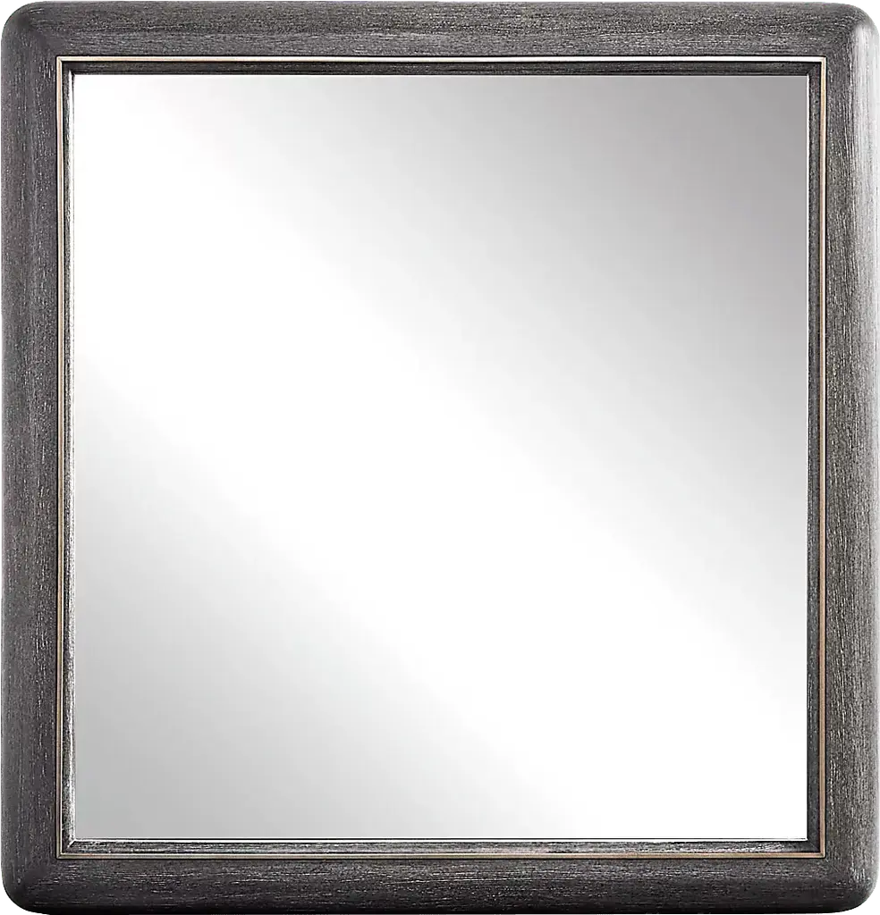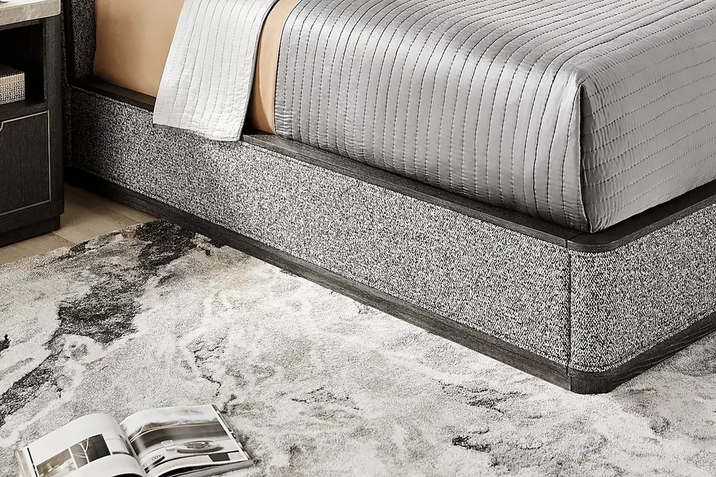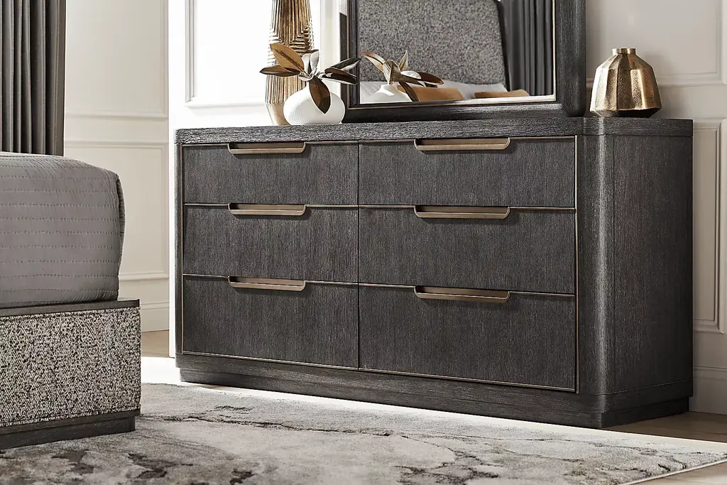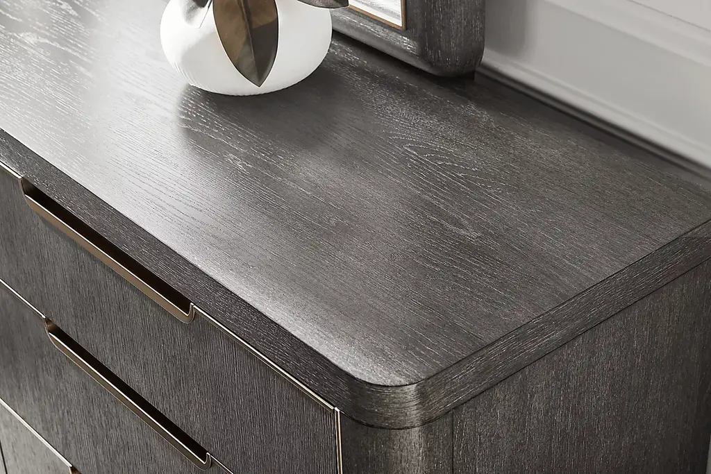 A grounding calm in tune with the rhythm of life infuses your room's natural ease when the Preston Heights bedroom from Drew & Jonathan comes home, blending peace and tranquility in the heart of your space. This contemporary collection features an upholstered bed in gray with a sloped shelter headboard. A wraparound footboard showcases the heathered fabric above a confident plinth-style base. The included dresser features framed drawers and custom built-in finger pull hardware in a coppery finish. A beveled mirror completes the look. Mattress and foundation (if required) sold separately.
