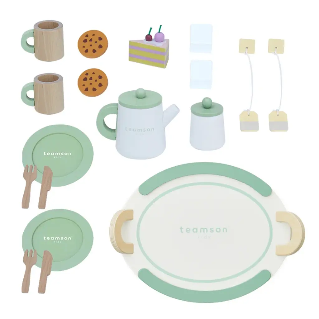 Whether your child is hosting a tea party with friends or entertaining their dolls and stuffed animals, this Little Chef Frankfurt Wooden Pretend Play Tea Set encourages imaginative play and social interaction. This 20-piece set includes a serving tray, two plates, knife, and fork table settings, teacups, cookies, cake, pretend sugar packets, tea bags, a teapot, and a sugar bowl. This charming wooden tea set is perfect for aspiring little hosts and hostesses and is both kid-safe and easy to clean.