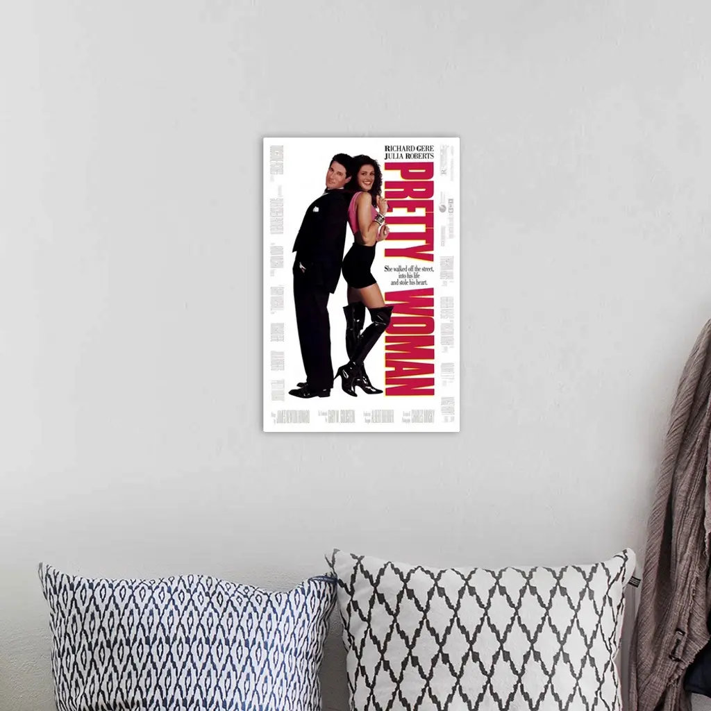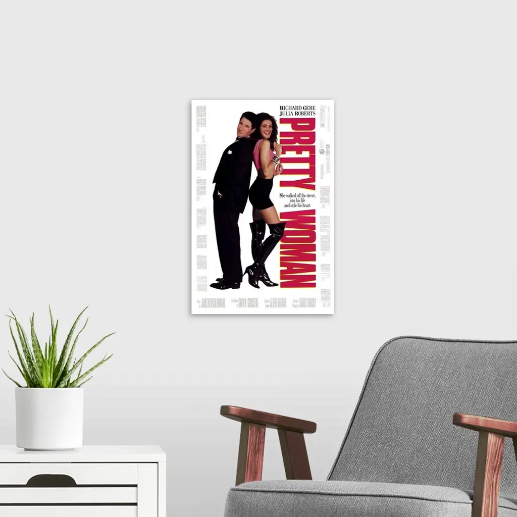 Vertical, large movie advertisement for "Pretty Woman", with Julia Roberts and Richard Gere standing back to back on a solid background. The edges of the image list additional cast and credits.