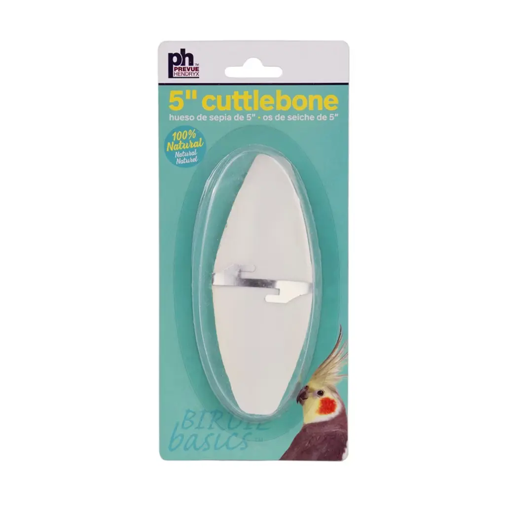 Prevue Pet Products 5" Cuttlebone 1143 is essential for birds of all sizes because it helps keep beaks trimmed. Includes a metal hanger. Since cuttlebone is a natural product, items may vary in color and size - ranging from 4 1/2" to 5" in length.