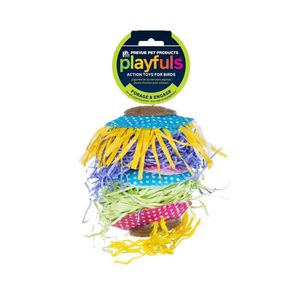 Prevue Pet Products Playfuls Barn Dance 62675 is a colorful, dangling pull toy designed for satisfying preening instincts and discouraging plucking in your bird. Our Barn Dance toy is made from an assortment of Sisal Ropes and multicolored paper, providing your bird with mental stimulation and hours of fun. The coconut shell is perfect for beak and tongue exercise. All materials are 100% pet safe with non-toxic, food-grade colors and connect easily to cage with stainless steel quick-link attachments– actual measurements may vary slightly. As always, supervise birds at play. Our Bance Dance toy measures 5" diameter and 6 1/2" high. Ideal for x-small, small, and medium birds measuring 4" to 18" beak to tail.