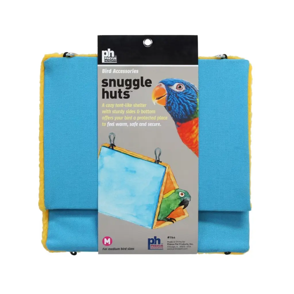 Prevue Pet Products snuggle hut 1164B is tent like shelter that offers birds a place to hide, play and sleep. Plastic inserts in bottom and sides help maintain shape. Fabric is machine washable. Sewn in hooks allow for easy insertion into cage. Available in assorted colors and machine washable. Hut measures 9 3/4" Long, 5 6/8 " Wide and 10 1/2" High.