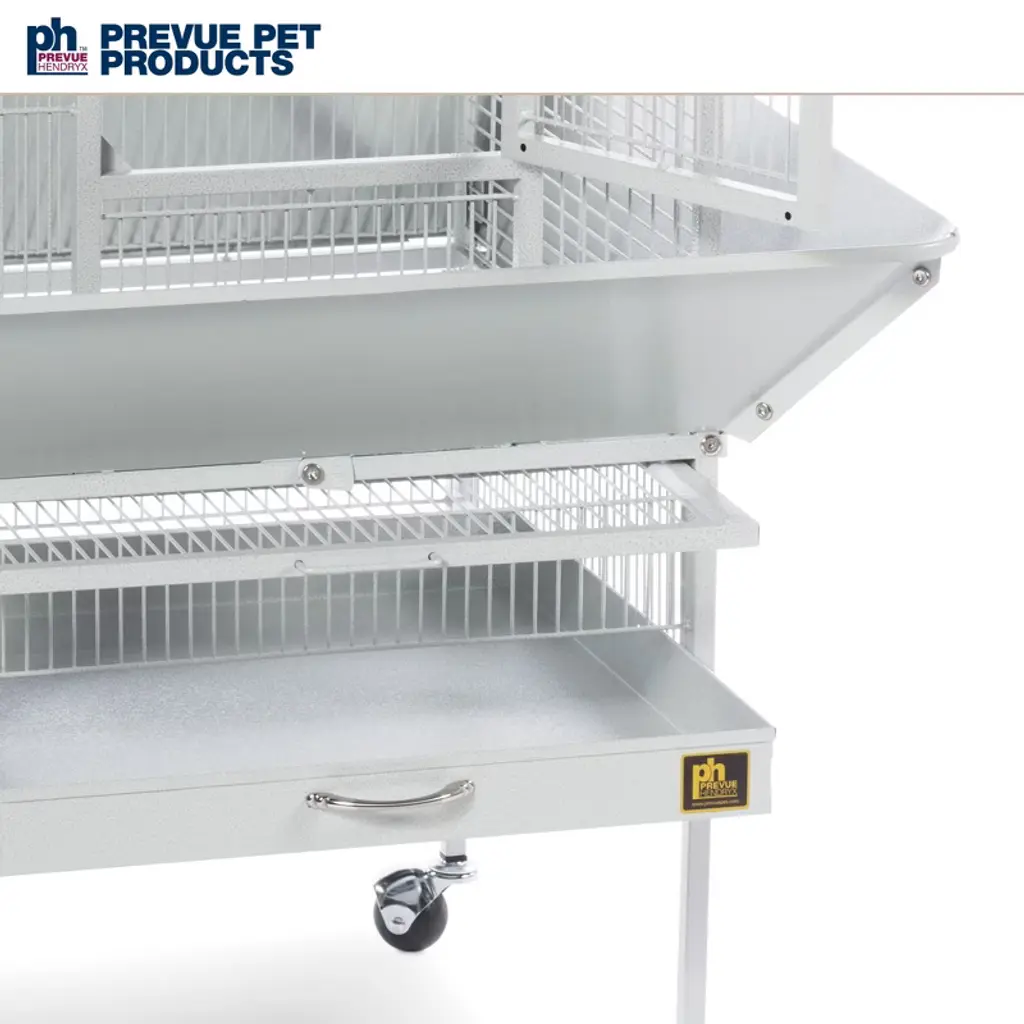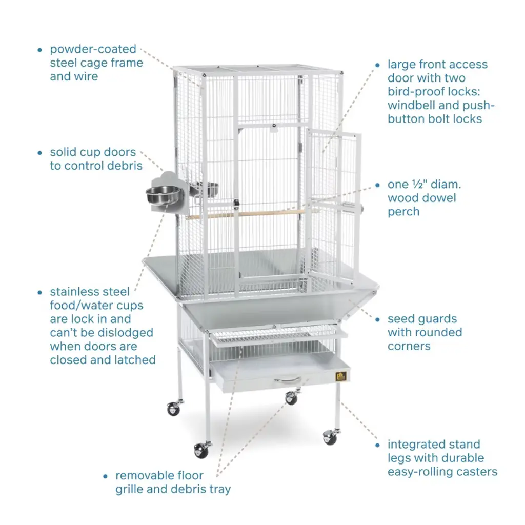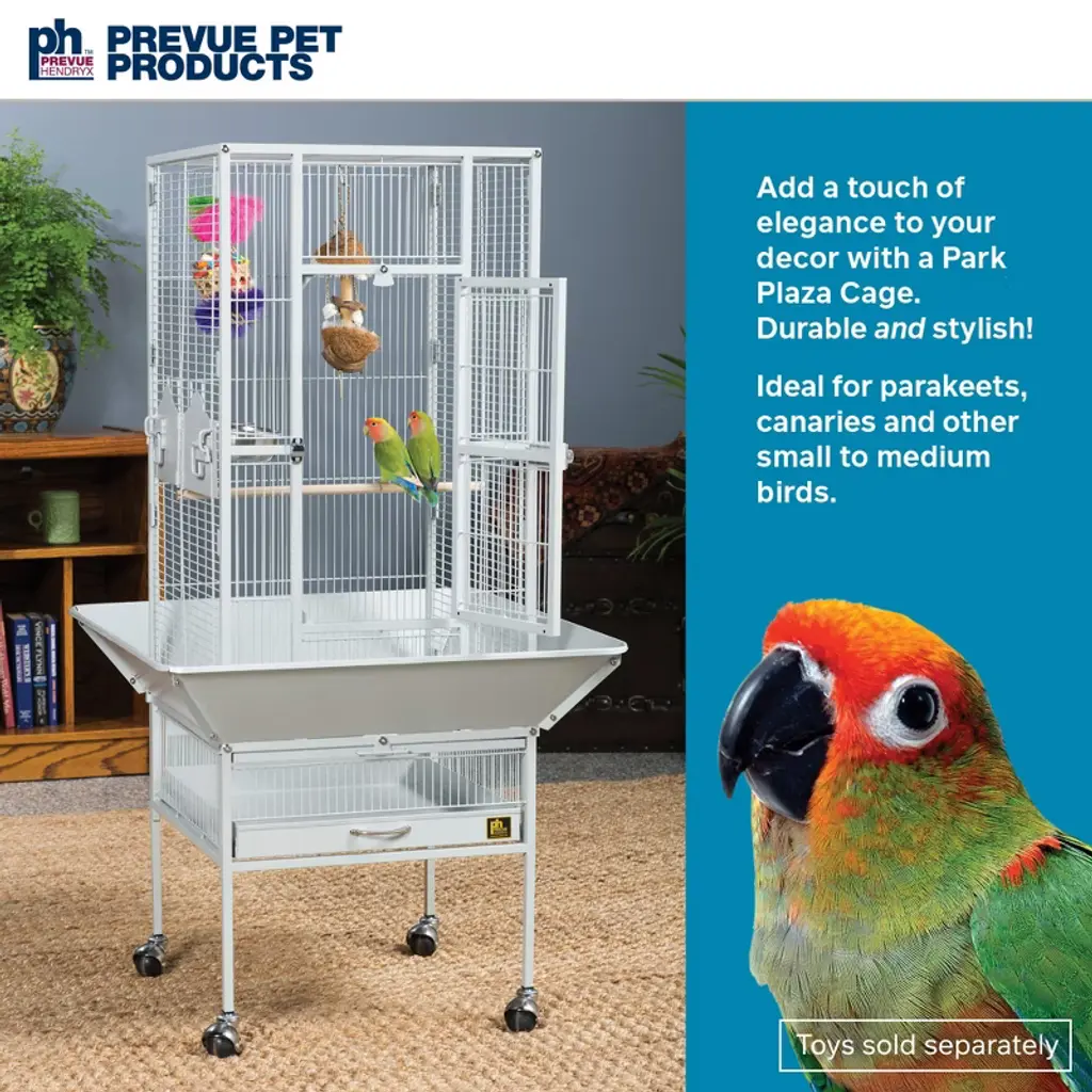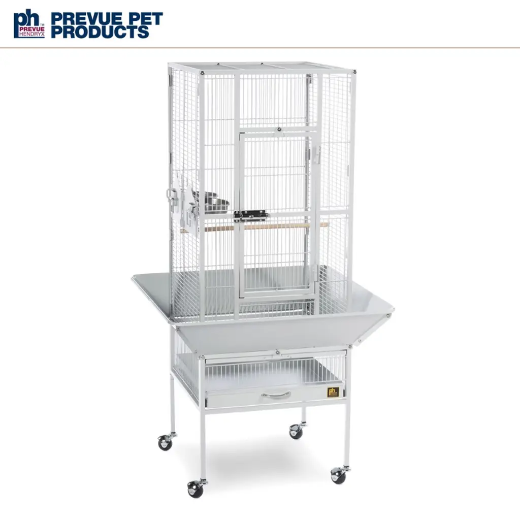 Prevue Pet Products Park Plaza Bird Cage Pewter 3351W offers quality craftsmanship at an affordable cost. Powder-coated steel construction, this cage is designed for parakeets, canaries and other small to medium sized birds. Cage includes one solid wood perch, two stainless steel cups and an easy rolling stand with casters. Pull out grille and debris tray make this cage easy to clean while the rounded corner seed guards and solid-panel cup doors control debris outside the cage. A heavy-duty lock plus additional wind-bell lock securely fasten the large front door. Our Park Plaza 3351W cage in Pewter measures 18" long, 18" wide and 49" high with 1/2" wire spacing.