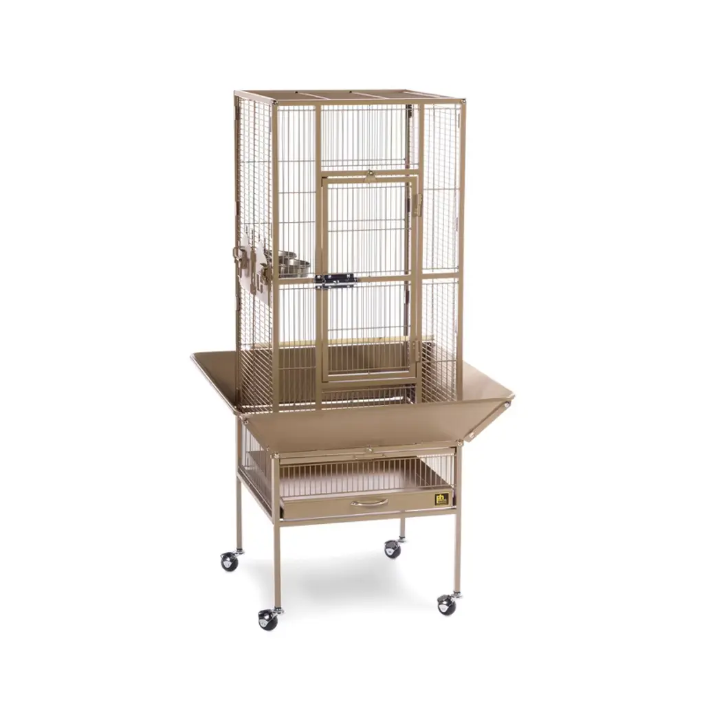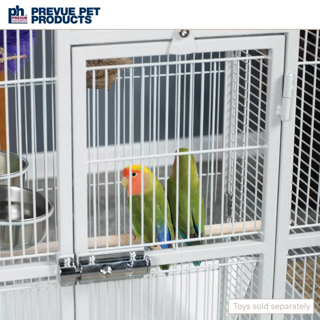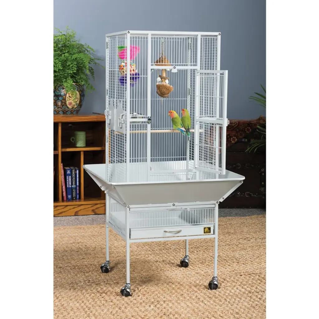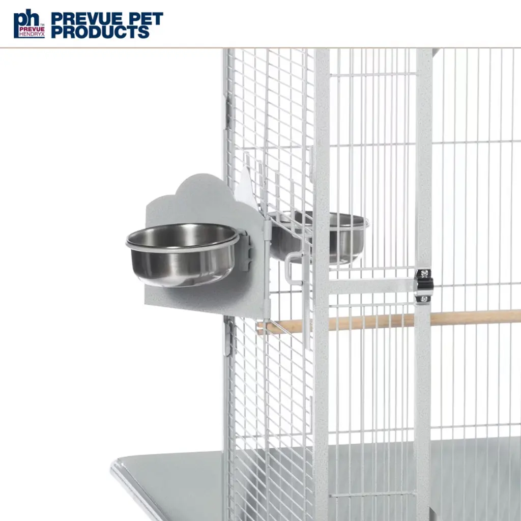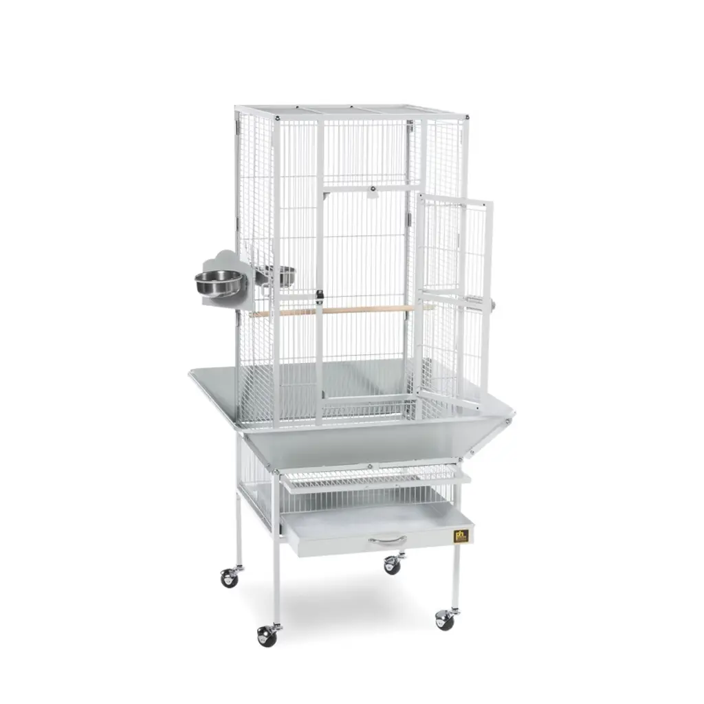 Prevue Pet Products Park Plaza Bird Cage Pewter 3351W offers quality craftsmanship at an affordable cost. Powder-coated steel construction, this cage is designed for parakeets, canaries and other small to medium sized birds. Cage includes one solid wood perch, two stainless steel cups and an easy rolling stand with casters. Pull out grille and debris tray make this cage easy to clean while the rounded corner seed guards and solid-panel cup doors control debris outside the cage. A heavy-duty lock plus additional wind-bell lock securely fasten the large front door. Our Park Plaza 3351W cage in Pewter measures 18" long, 18" wide and 49" high with 1/2" wire spacing.